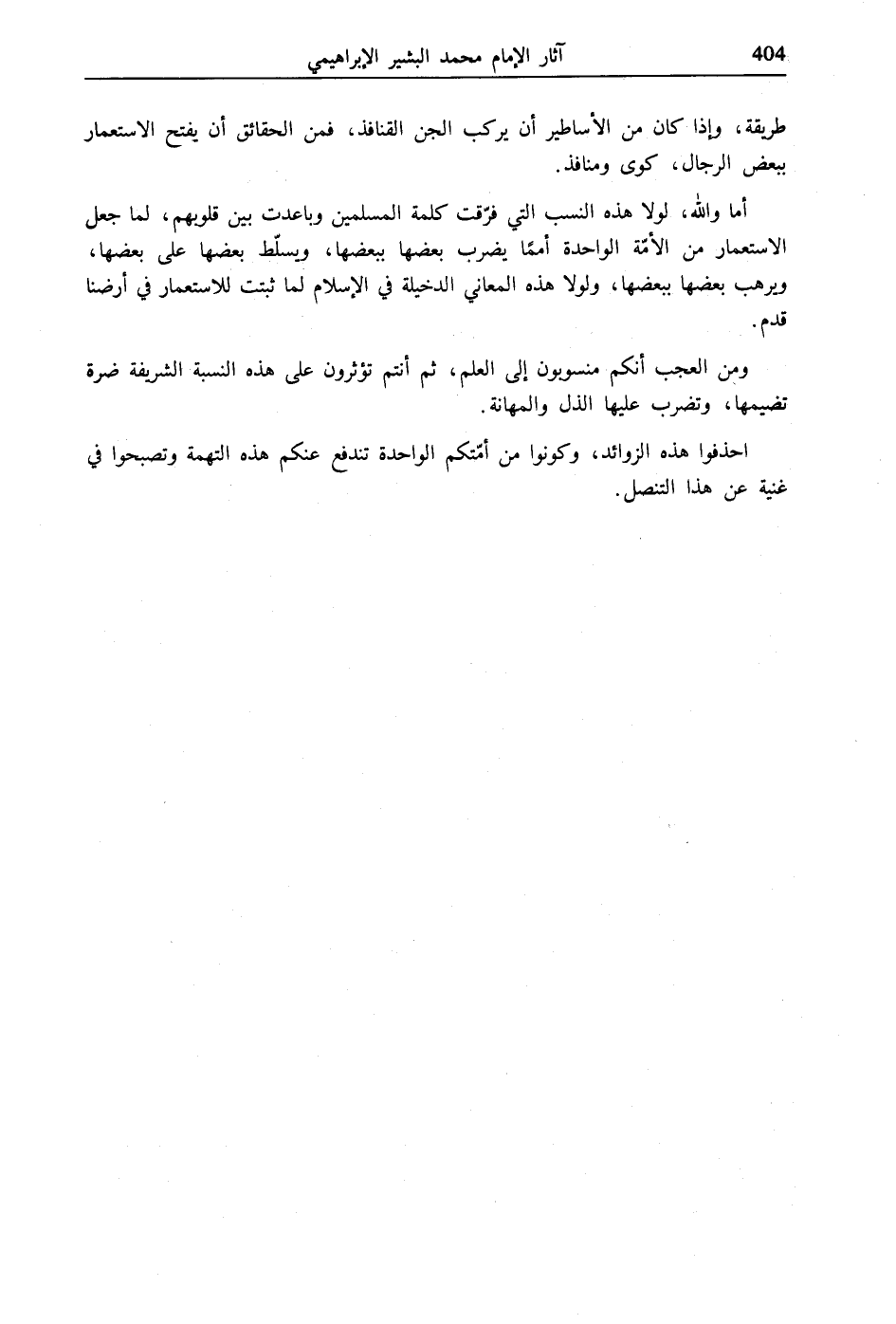 أما والله، لولا هذه النسب التي فرّقت كلمة المسلمين وباعدت بين قلويهم، لما جعل الاستعمار من الأمّة الواحدة أممًا يضرب بعضها ببعضها، ويسلّط بعضها على بعضها، ويرهب بعضها ببعضها، ولولا هذه المعاني الدخيلة في الإسلام لما ثبتت للاستعمار في أرضنا قدم.