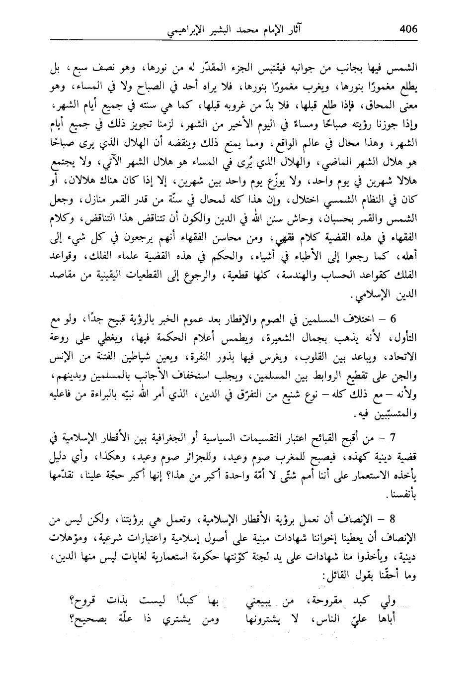 7 - من أقبح القبائح اعتبار التقسيمات السياسية أو الجغرافية بين الأقطار الإسلامية في قضية دينية كهذه، فيصبح للمغرب صوم وعيد، وللجزائر صوم وعيد، وهكذا، وأي دليل يأخذه الاستعمار على أننا أمم شتّى لا أمّة واحدة أكبر من هذا؟ إنها أكبر حجّة علينا، نقدّمها بأنفسنا.