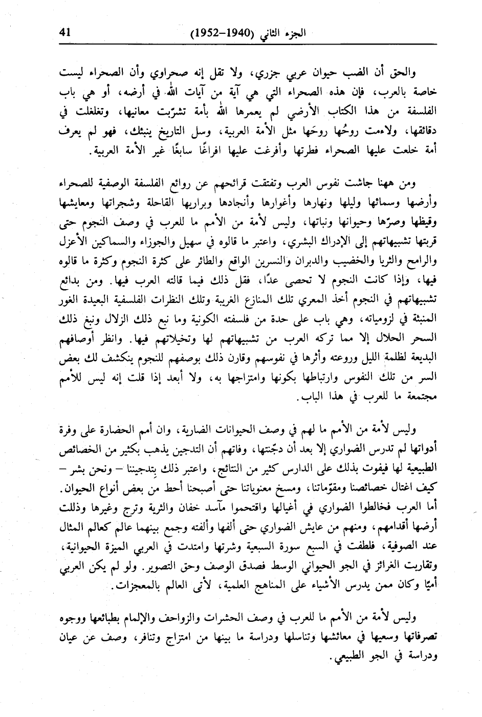 والحق أن الضب حيوان عربي جزري، ولا تقل إنه صحراوي وأن الصحراء ليست خاصة بالعرب، فإن هذه الصحراء التي هي آية من آيات الله. في أرضه، أو هي باب الفلسفة من هذا الكتاب الأرضي لم يعمرها الله بأمة تشرّبت معانيها، وتغلغلت في دقائقها، ولاءمت روحُها روحَها مثل الأمة العربية، وسل التاريخ ينبئك، فهو لم يعرف أمة خلعت عليها الصحراء فطرتها وأفرغت عليها إفراغًا سابغًا غير الأمة العربية.