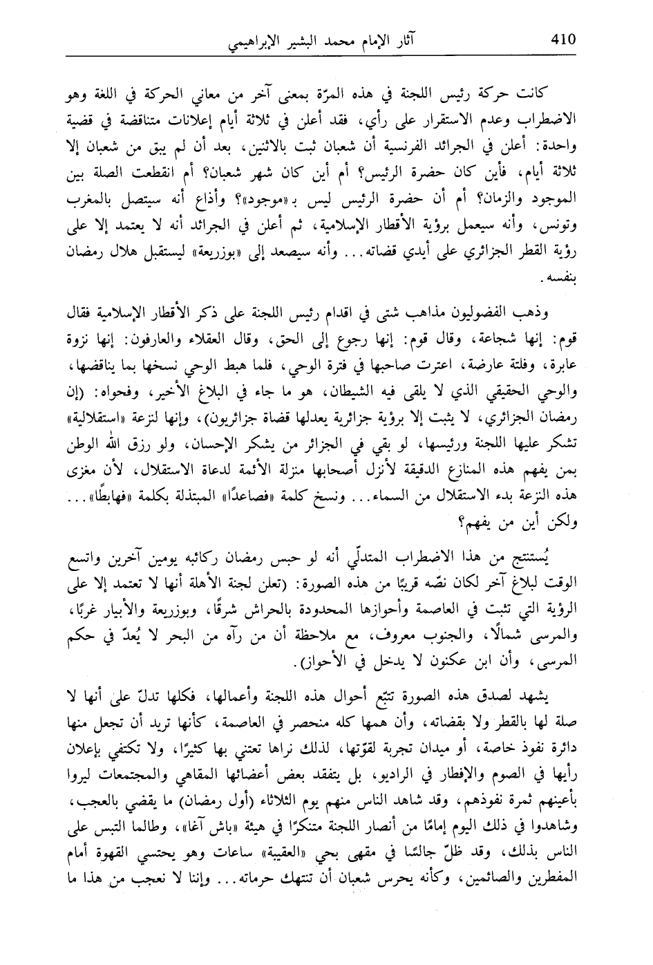 وذهب الفضوليون مذاهب شتى في اقدام رئيس اللجنة على ذكر الأقطار الإسلامية فقال قوم: إنها شجاعة، وقال قوم: إنها رجوع إلى الحق، وقال العقلاء والعارفون: إنها نزوة عابرة، وفلتة عارضة، اعترت صاحبها في فترة الوحي، فلما هبط الوحي نسخها بما يناقضها، والوحي الحقيقي الذي لا يلقى فيه الشيطان، هو ما جاء في البلاغ الأخير، وفحواه: (إن رمضان الجزائري، لا يثبت إلا برؤية جزائرية يعدلها قضاة جزائريون)، وإنها لنزعة "استقلالية" تشكر عليها اللجنة ورئيسها، لو بقي في الجزائر من يشكر الإحسان، ولو رزق الله الوطن بمن يفهم هذه المنازع الدقيقة لأنزل أصحابها منزلة الأئمة لدعاة الاستقلال، لأن مغزى هذه النزعة بدء الاستقلال من السماء ... ونسخ كلمة "فصاعدًا" المبتذلة بكلمة "فهابطًا" ... ولكن أين من يفهم؟