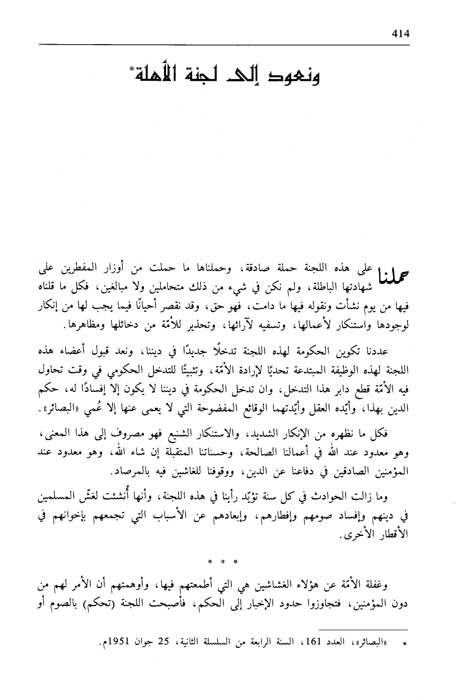 حملنا على هذه اللجنة حملة صادقة، وحملناها ما حملت من أوزار المفطرين على شهادتها الباطلة، ولم نكن في شيء من ذلك متحاملين ولا مبالغين، فكل ما قلناه فيها من يوم نشأت ونقوله فيها ما دامت، فهو حق، وقد نقصر أحيانًا فيما يجب لها من إنكار لوجودها واستنكار لأعمالها، وتسفيه لآرائها، وتحذير للأمّة من دخائلها ومظاهرها.