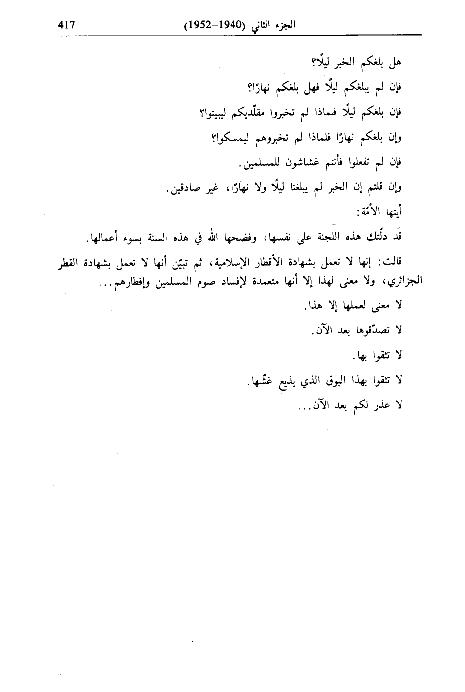 قد دلّتك هذه اللجنة على نفسها، وفضحها الله في هذه السنة بسوء أعمالها. قالت: إنها لا تعمل بشهادة الأقطار الإسلامية، ثم تبيّن أنها لا تعمل بشهادة القطر الجزائري، ولا معنى لهذا إلا أنها متعمدة لإفساد صوم المسلمين وإفطارهم ...