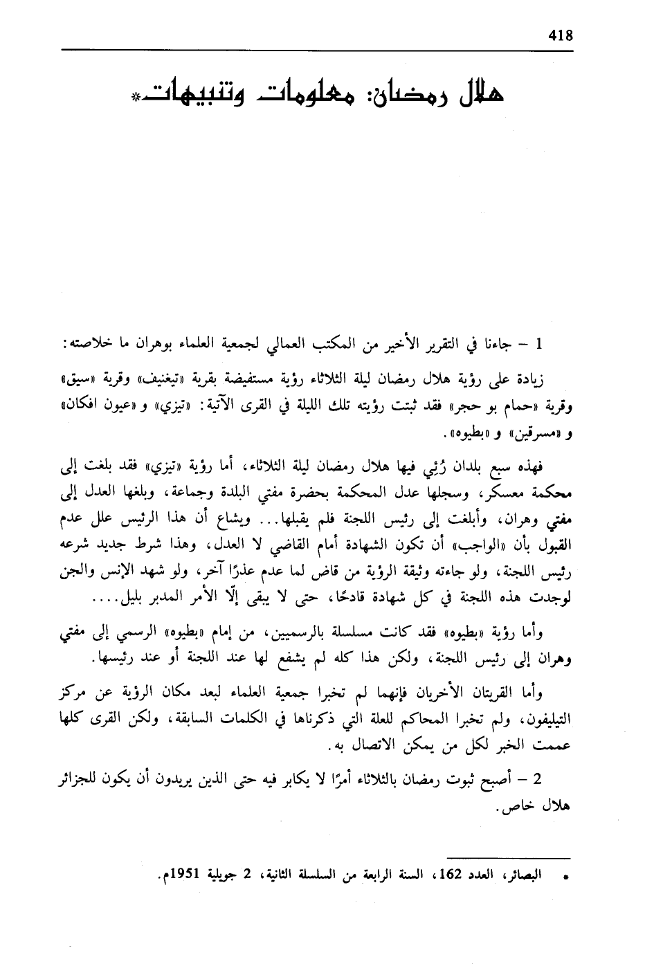 * " البصائر"، العدد 162، السنة الرابعة من السلسلة الثانية، 2 جويلية 1951م.