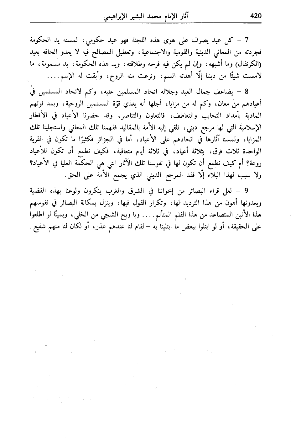 8 - يضاعف جمال العيد وجلاله اتحاد المسلمين عليه، وكم لاتحاد المسلمين في أعيادهم من معان، وكم له من مزايا، أجلها أنه يغذي قوّة المسلمين الروحية، ويمد قوتهم المادية بأمداد التحابب والتعاطف، فالتعاون والتناصر، وقد حضرنا الأعياد في الأقطار الإسلامية التي لها مرجع ديني، تلقي إليه الأمة بالمقاليد ففهمنا تلك المعاني واستجلينا تلك المزايا، ولمسنا آثارها في اتحادهم على الأعياد، أما في الجزائر فكثيرًا ما تكون في القرية الواحدة ثلاث فرق، بثلاثة أعياد، في ثلاثة أيام متعاقبة، فكيف نطمع أن تكون للأعياد روعة؟ أم كيف نطمع أن تكون لها في نفوسنا تلك الآثار التي هي الحكمة العليا في الأعياد؟ ولا سبب لهذا البلاء إلّا فقد المرجع الديني الذي يجمع الأمة على الحق.