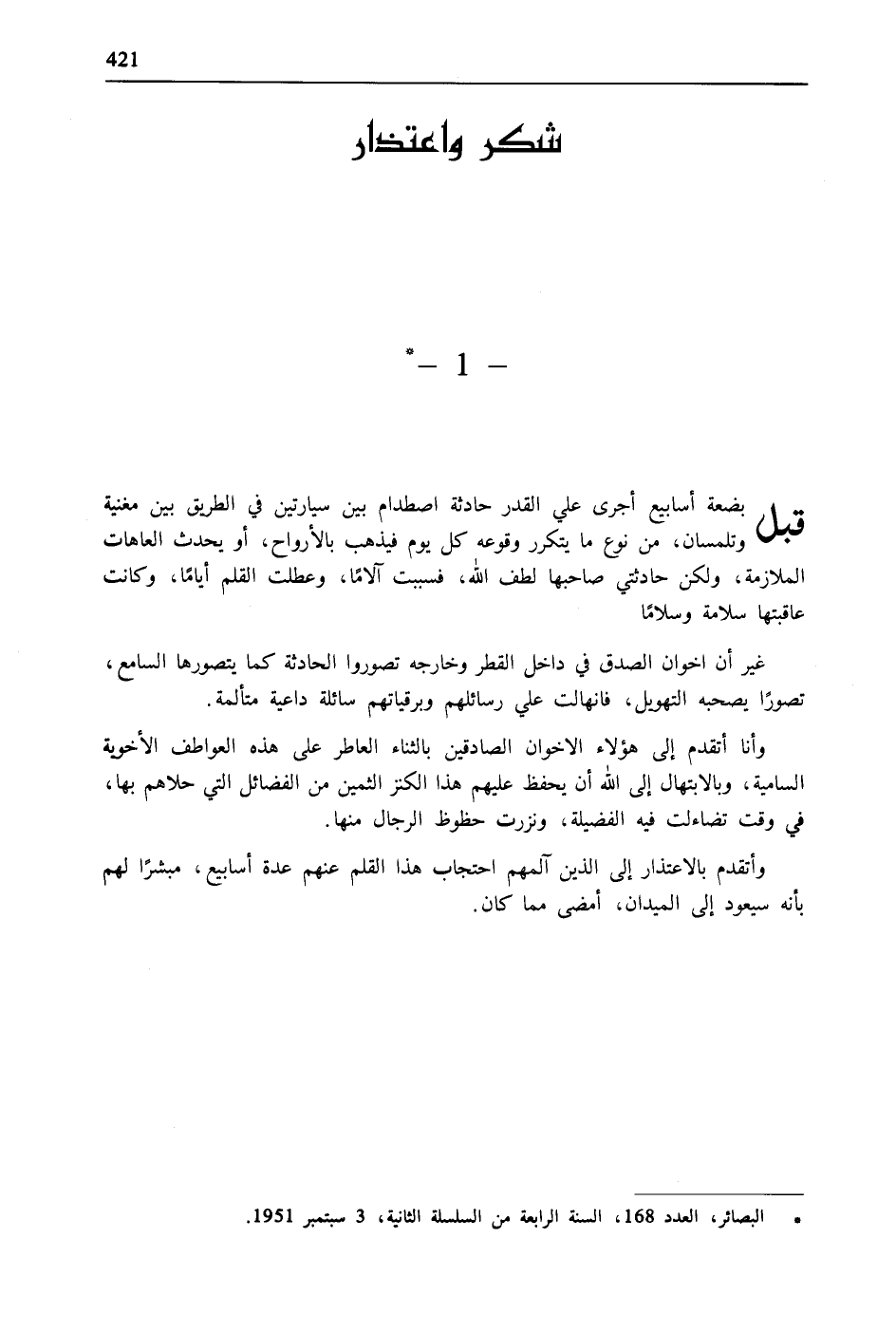 وأتقدم بالاعتذار إلى الذين آلمهم احتجاب هذا القلم عنهم عدة أسابيع، مبشرًا لهم بأنه سيعود إلى الميدان، أمضى مما كان.