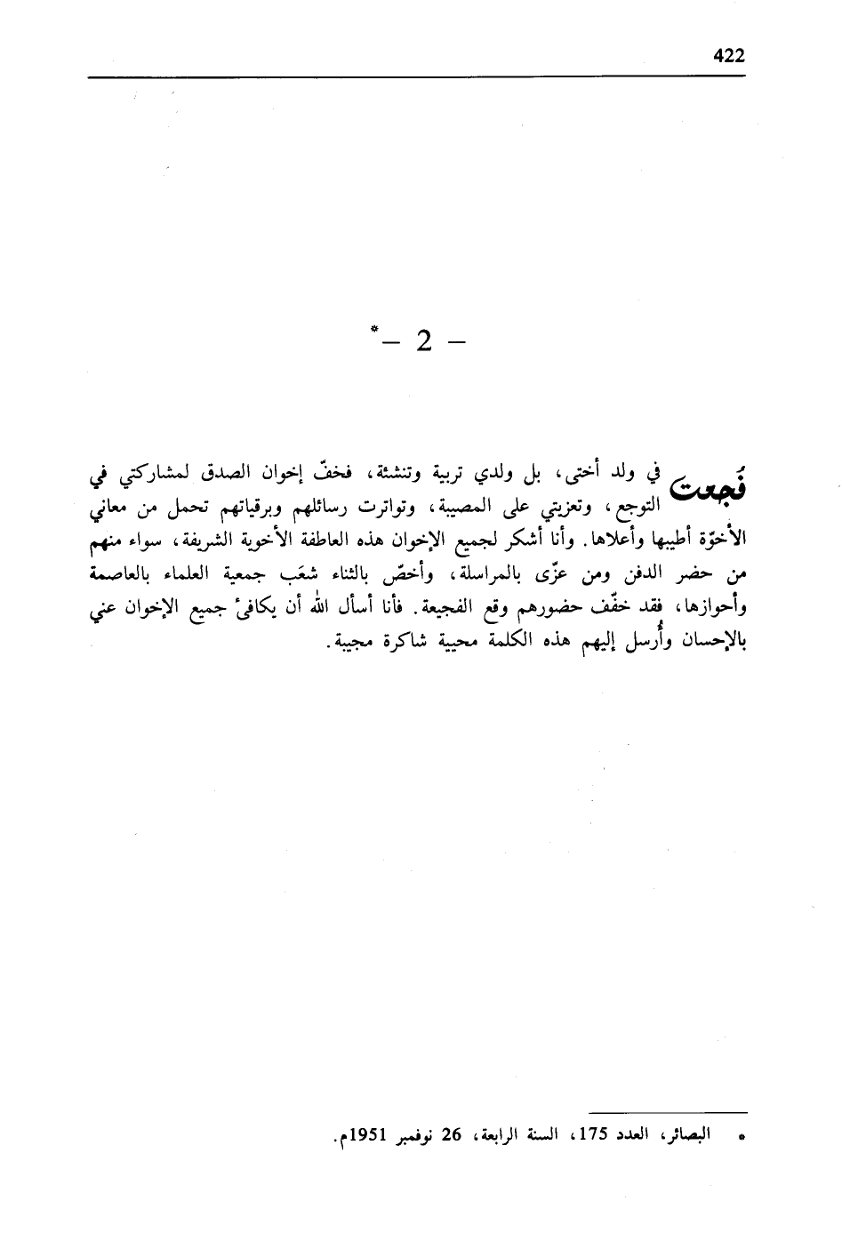 فُجعت في ولد أختى، بل ولدي تربية وتنشئة، فخفّ إخوان الصدق لمشاركتي في التوجع، وتعزيتي على المصيبة، وتواترت رسائلهم وبرقياتهم تحمل من معاني الأخوّة أطيبها وأعلاها. وأنا أشكر لجميع الإخوان هذه العاطفة الأخوية الشريفة، سواء منهم من حضر الدفن ومن عزّى بالمراسلة، وأخصّ بالثناء شعَب جمعية العلماء بالعاصمة وأحوازها، فقد خفّف حضورهم وقع الفجيعة. فأنا أسأل الله أن يكافئ جميع الإخوان عني بالإحسان وأُرسل إليهم هذه الكلمة محيية شاكرة مجيبة.