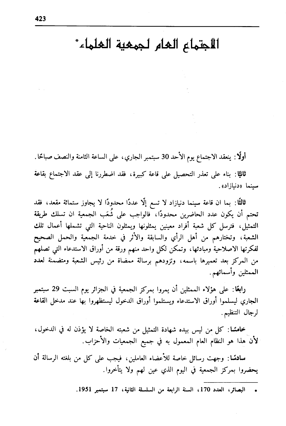 * "البصائر"، العدد 170، السنة الرابعة من السلسلة الثانية، 17 سبتمبر 1951.