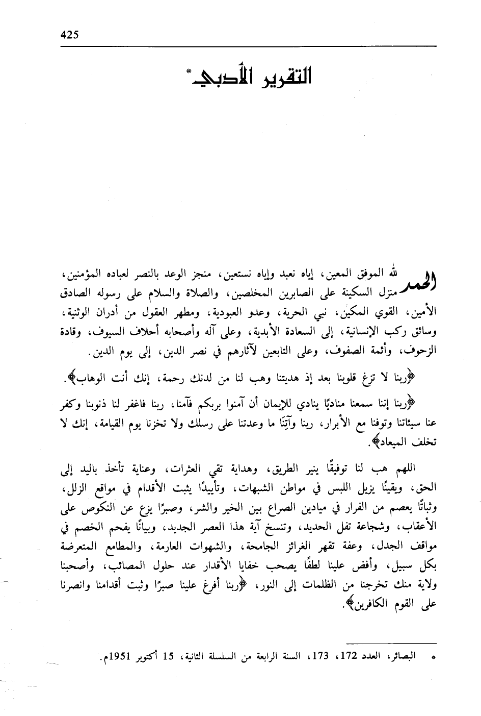 * "البصائر"، العدد 172، 173، السنة الرابعة من السلسلة الثانية، 15 أكتوبر 1951م.