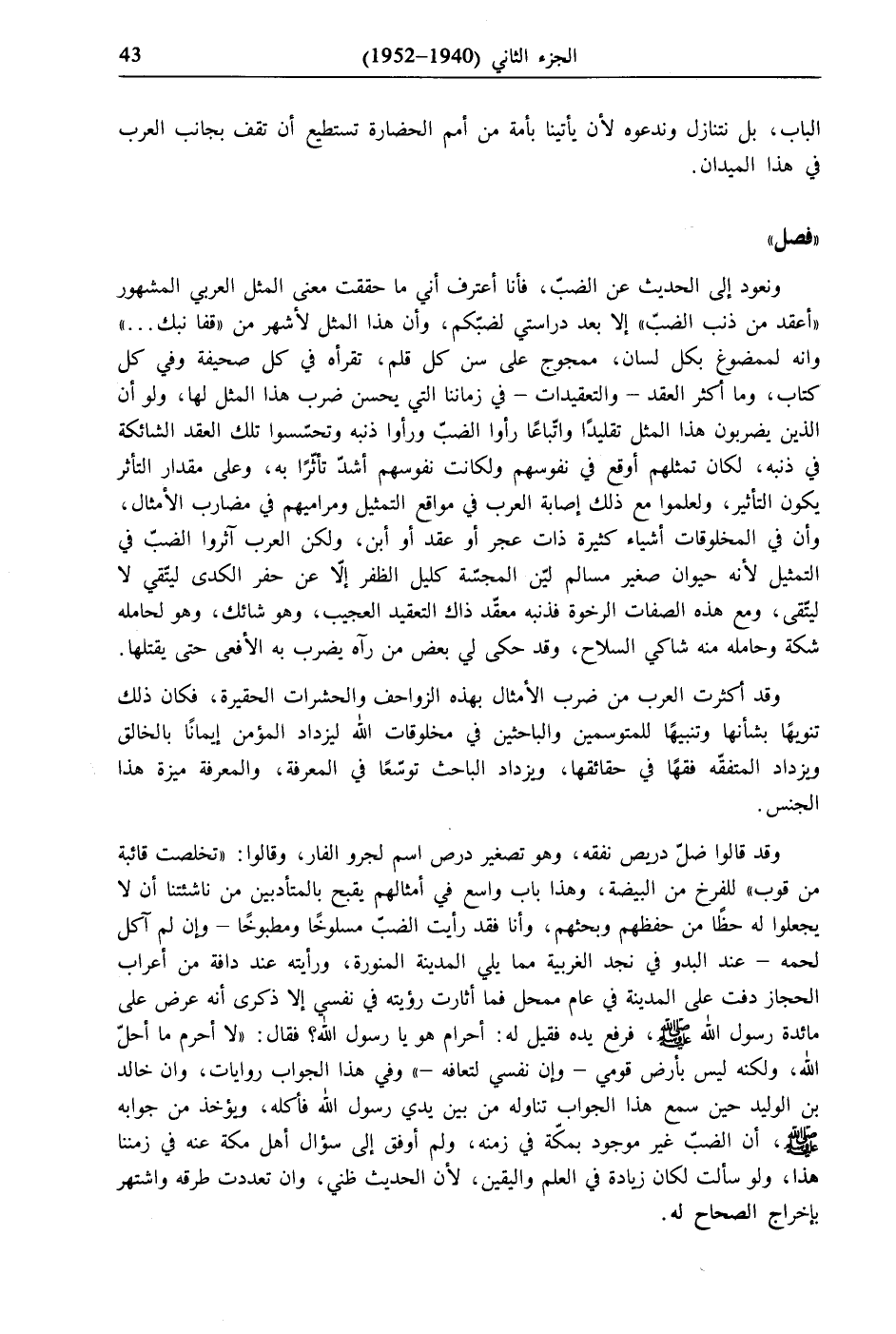 وقد قالوا ضلّ دريص نفقه، وهو تصغير درص اسم لجرو الفار، وقالوا: "تخلصت قائبة من قوب" للفرخ من البيضة، وهذا باب واسع في أمثالهم يقبح بالمتأدبين من ناشئتنا أن لا يجعلوا له حظًا من حفظهم وبحثهم، وأنا فقد رأيت الضبّ سلوخًا ومطبوخًا- وإن لم آكل لحمه- عند البدو في نجد الغربية مما يلي المدينة المنورة، ورأيته عند دافة من أعراب الحجاز دفت على المدينة في عام ممحل فما أثارت رؤيته في نفسي إلا ذكرى أنه عرض على مائدة رسول الله - صلى الله عليه وسلم - فرفع يده فقيل له: أحرام هو يا رسول الله؟ فقال: «لا أحرم ما أحلّ الله، ولكنه ليس بأرض قومي- وإن نفسي لتعافه-» وفي هذا الجواب روايات، وان خالد بن الوليد حين سمع هذا الجواب تناوله من بين يدي رسول الله فأكله، ويؤخذ من جوابه - صلى الله عليه وسلم -، أن الضبّ غير موجود بمكة في زمنه، ولم أوفق إلى سؤال أهل مكة عنه في زمننا هذا، ولو سألت لكان زيادة في العلم واليقين، لأن الحديث ظني، وان تعددت طرقه واشتهر بإخراج الصحاح له.