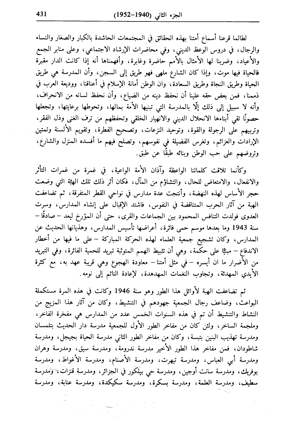 وكأنما تلاقت كلماتنا الواعظة وآذان الأمة الواعية، في غمرة من غمرات التأثر والانفعال، والامتعاض للحال، والتشاؤم من المآل، فكان أثر ذلك تلك الهبَّة التي وضعت حجر الأساس لهذه النهضة، وأنتجت عدة مدارس في نواحي القطر المتفرقة، ثم تضاعفت الهبة من آثار الحرب المتناقضة في النفوس، فاشتد الإقبال على إنشاء المدارس، وسرت العدوى فولدت التنافس المحمود بين الجماعات والقرى، حتى أن المؤرخ ليعد- صادقًا- سنة 1943 وما بعدها موسم حمى فائرة، أعراضها تأسيس المدارس، وهذيانها الحديث عن المدارس، وكان تشجيع جمعية العلماء لهذه الحركة المباركة- على ما فيها من أخطار الاندفاع- مبنيًّا على حكمة، وهي أن تثبيط الهمم المتوثبة تبريد للحمية الفائرة، وفي التبريد من الأضرار ما ان أيسره- في مثل أمتنا- معاودة الهجوع وهي قريبة عهد به، مع كثرة الأيدي المهدئة، وتجاوب النغمات المهدهدة، لإعادة النائم إلى نومه.