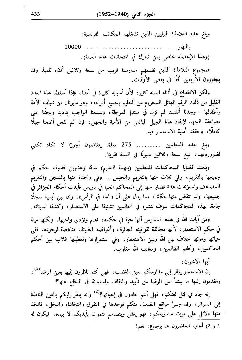 وبلغت قضايا المحاكمات للمعلمين (بتهمة التعليم) سبعًا وعشرين قضية، حكم في جميعها بالتغريم، وفي ثلاث منها بالتغريم والحبس ... وفي واحدة منها بالسجن والتغريم المضاعف واستؤنفت عدة قضايا منها إلى المحاكم العليا في باريس فأيدت أحكام الجزائر في جميعها، ولم تنقض منها حكمًا، مما يدل على أن "العلة في الرأس"، وأن بين أيدينا سجلًا جامعًا لهذه المحاكمات سوف ننشره في العالمين تشنيعًا على الاستعمار، وكشفًا لسيئاته.