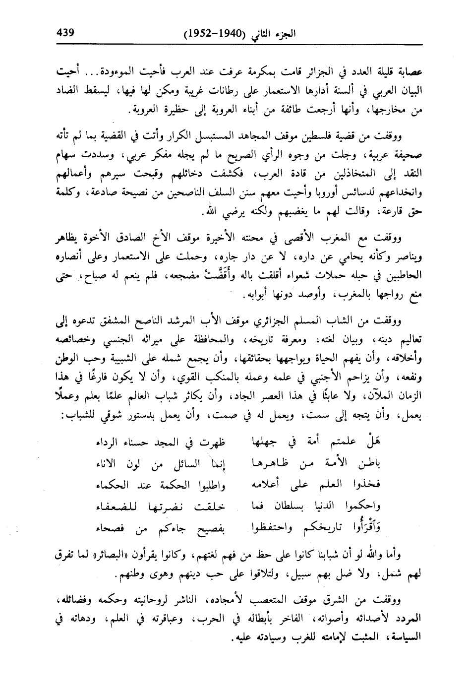 عصابة قليلة العدد في الجزائر قامت بمكرمة عرفت عند العرب فأحيت الموءودة ... أحيت البيان العربي في ألسنة أدارها الاستعمار على رطانات غريبة ومكن لها فيها، ليسقط الضاد من مخارجها، وأنها أرجعت طائفة من أبناء العروبة إلى حظيرة العروبة.