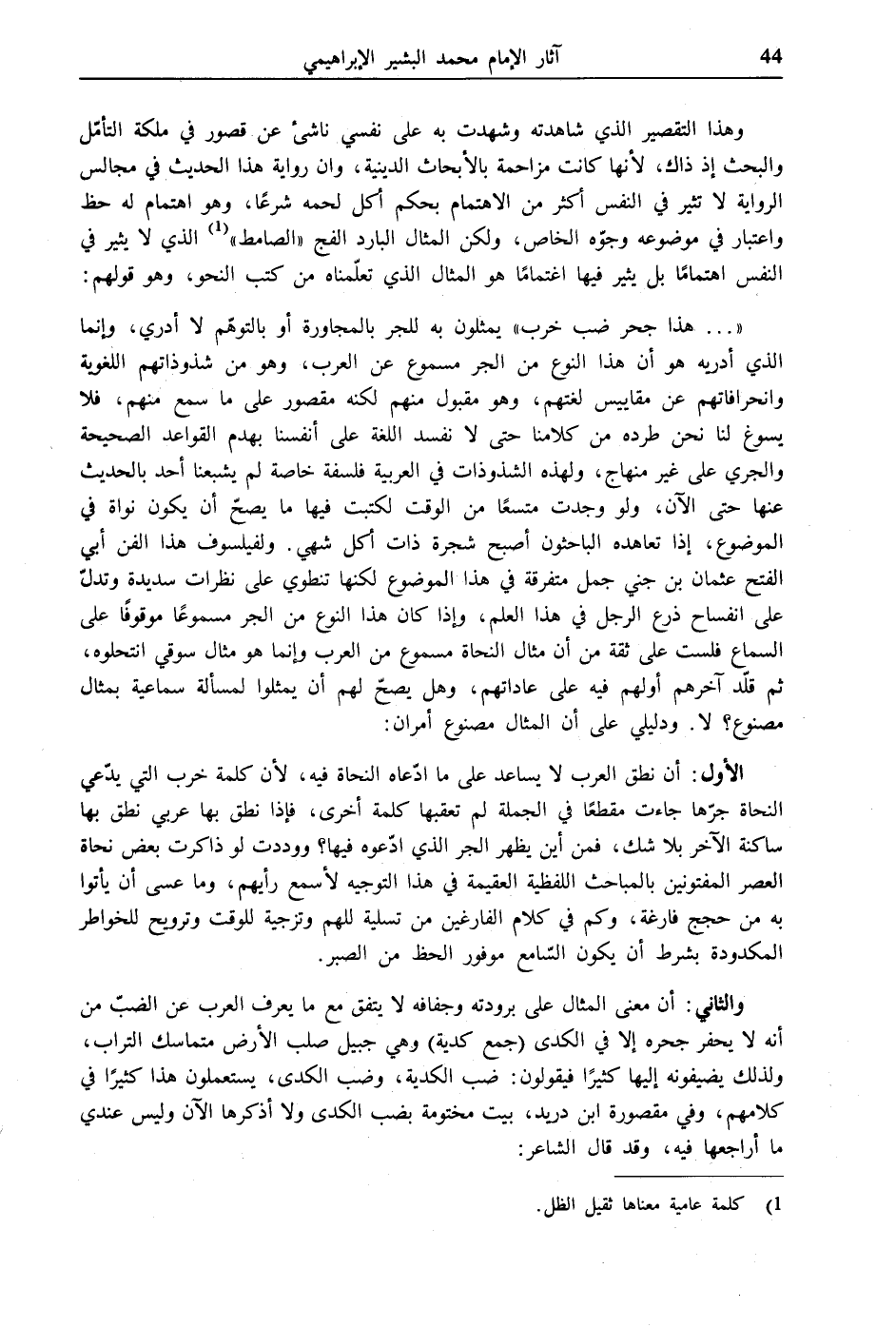وهذا التقصير الذي شاهدته وشهدت به على نفسي ناشئ عن قصور في ملكة التأمّل والبحث إذ ذاك، لأنها كانت مزاحمة بالأبحاث الدينية، وان رواية هذا الحديث في مجالس الرواية لا تثير في النفس أكثر من الاهتمام بحكم أكل لحمه شرعًا، وهو اهتمام له حظ واعتبار في موضوعه وجوّه الخاص، ولكن المثال البارد الفج "الصامط" (1) الذي لا يثير في النفس اهتمامًا بل يثير فيها اغتمامًا هو المثال الذي تعلّمناه من كتب النحو، وهو قولهم: " ... هذا جحر ضب خرب" يمثلون به للجر بالمجاورة أو بالتوهّم لا أدري، وانما الذي أدريه هو أن هذا النوع من الجر مسموع عن العرب، وهو من شذوذاتهم اللغوية وانحرافاتهم عن مقاييس لغتهم، وهو مقبول منهم لكنه مقصور على ما سمع منهم، فلا يسوغ لنا نحن طرده من كلامنا حتى لا نفسد اللغة على أنفسنا بهدم القواعد الصحيحة والجري على غير منهاج، ولهذه الشذوذات في العربية فلسفة خاصة لم يشبعنا أحد بالحديث عنها حتى الآن، ولو وجدت متسعًا من الوقت لكتبت فيها ما يصحّ أن يكون نواة في الموضوع، إذا تعاهده الباحثون أصبح شجرة ذات أكل شهي. ولفيلسوف هذا الفن أبي الفتح عثمان بن جني جمل متفرقة في هذا الموضوع لكنها تنطوي على نظرات سديدة وتدلّ على انفساح ذرع الرجل في هذا العلم، وإذا كان هذا النوع من الجر مسموعًا موقوفًا على السماع فلست على ثقة من أن مثال النحاة مسموع من العرب وإنما هو مثال سوقي انتحلوه، ثم قلّد آخرهم أولهم فيه على عاداتهم، وهل يصحّ لهم أن يمثلوا لمسألة سماعية بمثال مصنوع؟ لا. ودليلي على أن المثال مصنوع أمران: