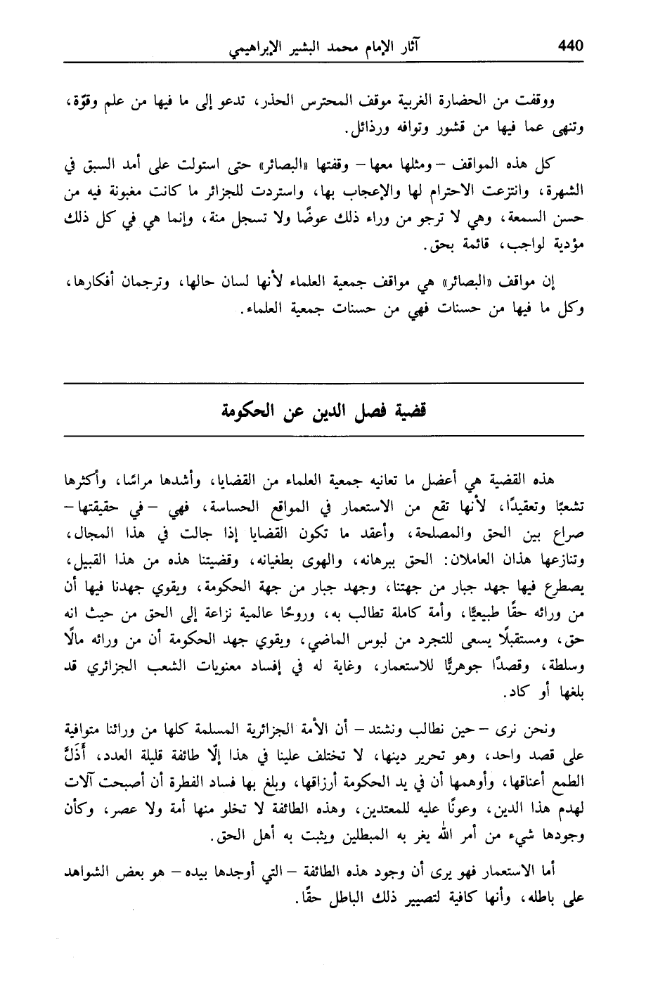 إن مواقف "البصائر" هي مواقف جمعية العلماء لأنها لسان حالها، وترجمان أفكارها، وكل ما فيها من حسنات فهي من حسنات جمعية العلماء.