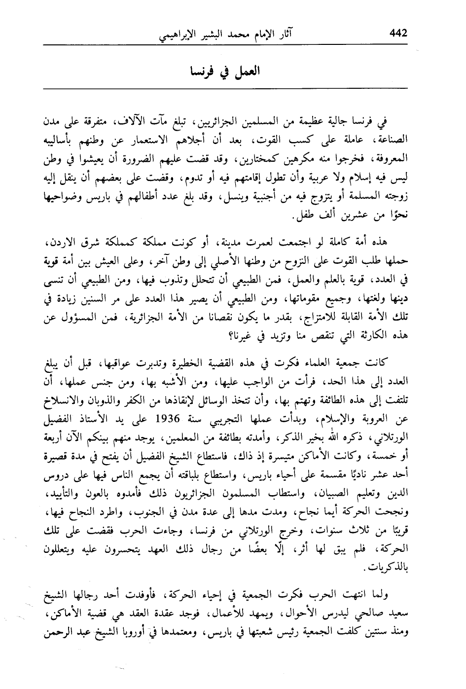 كانت جمعية العلماء فكرت في هذه القضية الخطيرة وتدبرت عواقبها، قبل أن يبلغ العدد إلى هذا الحد، فرأت من الواجب عليها، ومن الأشبه بها، ومن جنس عملها، أن تلتفت إلى هذه الطائفة وتهتم بها، وأن تتخذ الوسائل لإنقاذها من الكفر والذوبان والانسلاخ عن العروبة والإسلام، وبدأت عملها التجريبي سنة 1936 على يد الأستاذ الفضيل الورتلاني، ذكره الله بخير الذكر، وأمدته بطائفة من المعلمين، يوجد منهم بينكم الآن أربعة أو خمسة، وكانت الأماكن متيسرة إذ ذاك، فاستطاع الشيخ الفضيل أن يفتح في مدة قصيرة أحد عشر ناديًا مقسمة على أحياء باريس، واستطاع بلباقته أن يجمع الناس فيها على دروس الدين وتعليم الصبيان، واستطاب المسلمون الجزائريون ذلك فأمدوه بالعون والتأييد، ونجحت الحركة أيما نجاح، ومدت مدها إلى عدة مدن في الجنوب، واطرد النجاح فيها، قريبًا من ثلاث سنوات، وخرج الورتلاني من فرنسا، وجاءت الحرب فقضت على تلك الحركة، فلم يبق لها أثر، إلّا بعضًا من رجال ذلك العهد يتحسرون عليه ويتعللون با ذكريات.