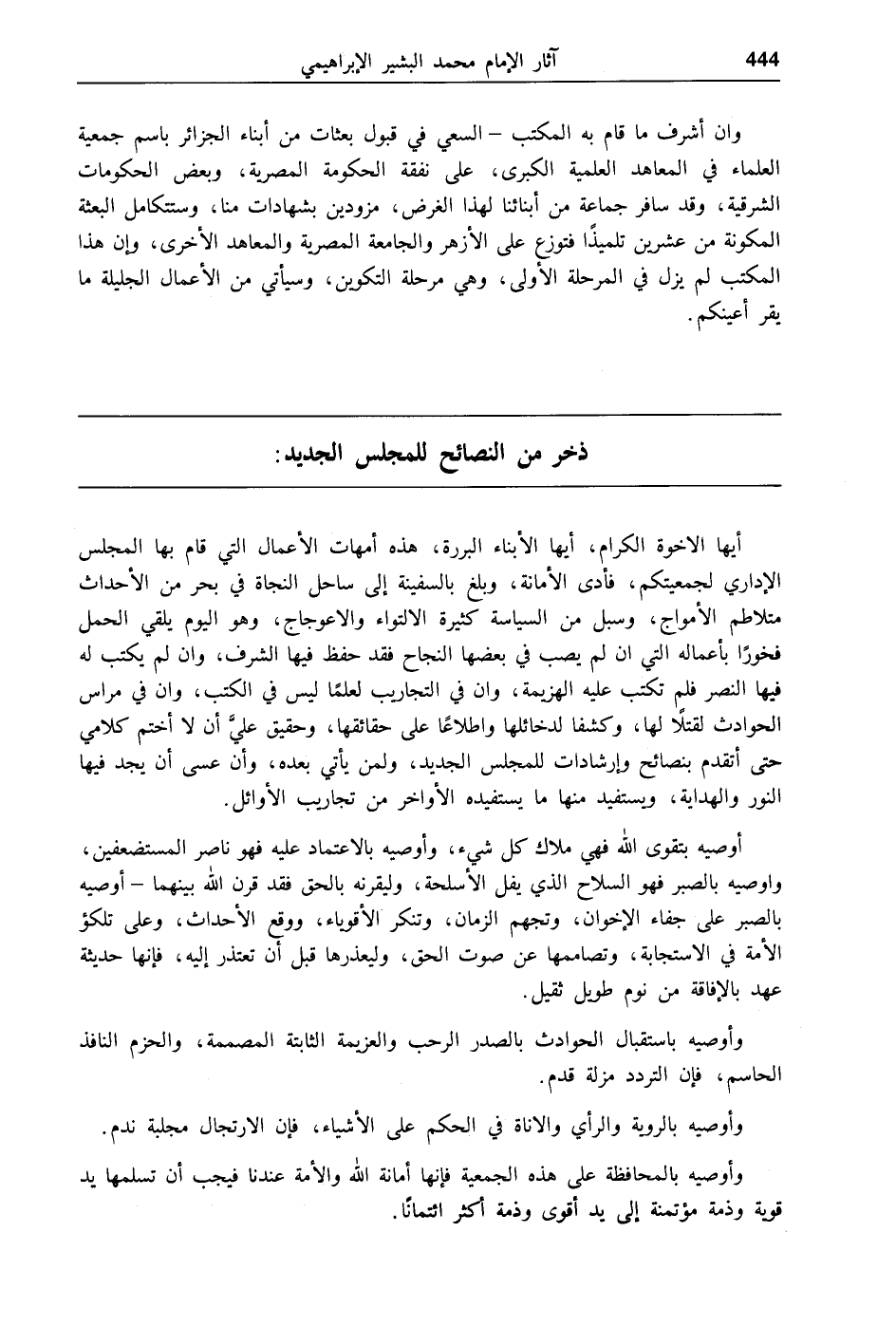وان أشرف ما قام به المكتب- السعي في قبول بعثات من أبناء الجزائر باسم جمعية العلماء في المعاهد العلمية الكبرى، على نفقة الحكومة المصرية، وبعض الحكومات الشرقية، وقد سافر جماعة من أبنائنا لهذا الغرض، مزودين بشهادات منا، وستتكامل البعثة المكونة من عشرين تلميذا فتوزع على الأزهر والجامعة المصرية والمعاهد الأخرى، وإن هذا المكتب لم يزل في المرحلة الأولى، وهي مرحلة التكوين، وسيأتي من الأعمال الجليلة ما يقر أعينكم.