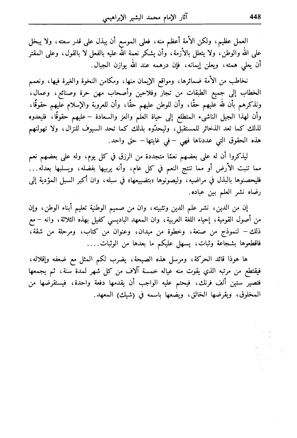 إن من الدين، نشر علم الدين وتثبيته، وإن من صميم الوطنية تعليم أبناء الوطن، وإن من أصول القومية، إحياء اللغة العربية، وإن المعهد الباديسي كفيل بهذه الثلاثة، وإنه- مع ذلك- لنموذج من صنعة، وخطوة من ميدان، وعنوان من كتاب، ومرحلة من شقة، فاقطعوها بشجاعة وثبات، يسهل عليكم ما بعدها من الوثبات ....