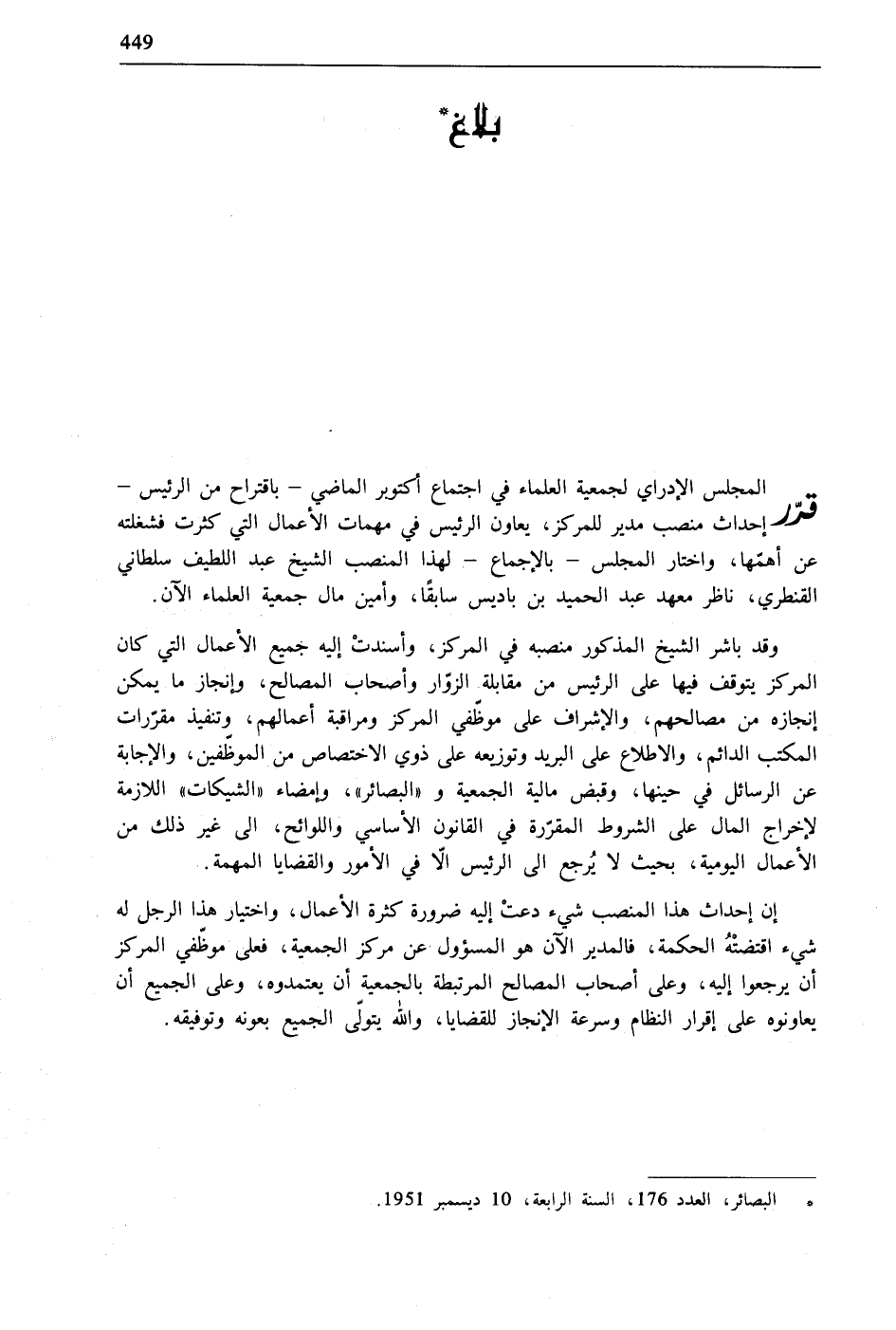 قرر المجلس الإدراي لجمعية العلماء في اجتماع أكتوبر الماضي- باقتراح من الرَّئِيسُ- إحداث منصب مدير للمركز، يعاون الرَّئِيسُ في مهمات الأعمال التي كثرت فشغلته عن أهمّها، واختار المجلس- بالإجماع- لهذا المنصب الشيخ عبد اللطيف سلطاني القنطري، ناظر معهد عبد الحميد بن باديس سابقًا، وأمين مال جمعية العلماء الآن.