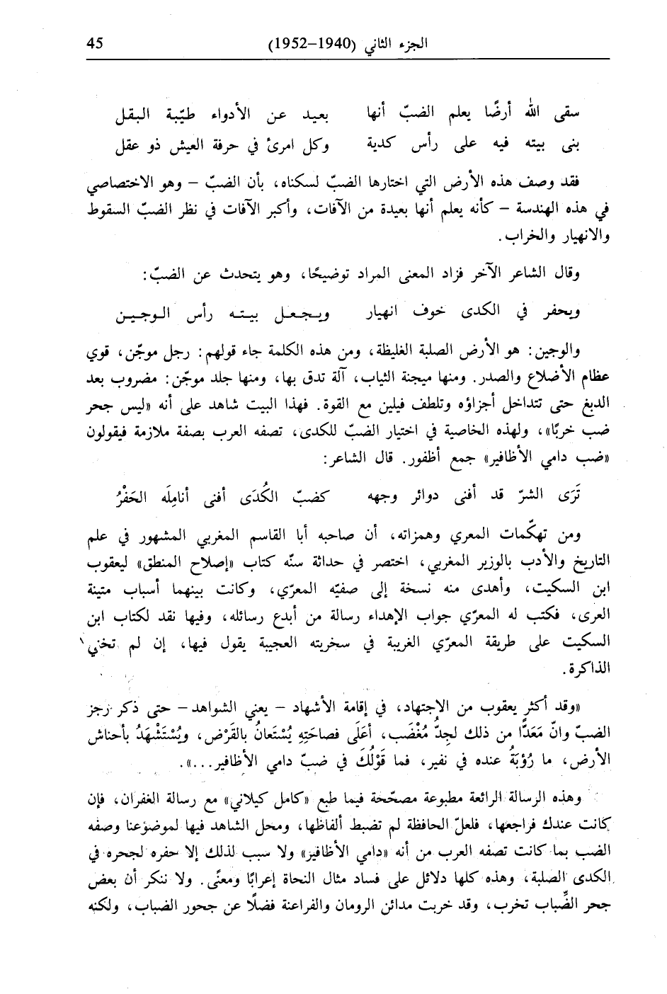 وهذه الرسالة الرائعة مطبوعة مصحّحة فيما طبع "كامل كيلاني" مع رسالة الغفران، فإن كانت عندك فراجعها، فلعلّ الحافظة لم تضبط ألفاظها، ومحل الشاهد فيها لموضوعنا وصفه الضب بما كانت تصفه العرب من أنه "دامي الأظافير" ولا سبب لذلك إلا حفره لجحره في الكدى الصلبة، وهذه كلها دلائل على فساد مثال النحاة إعرابًا ومعنًى. ولا ننكر أن بعض جحر الضِّباب تخرب، وقد خربت مدائن الرومان والفراعنة فضلًا عن جحور الضباب، ولكنه