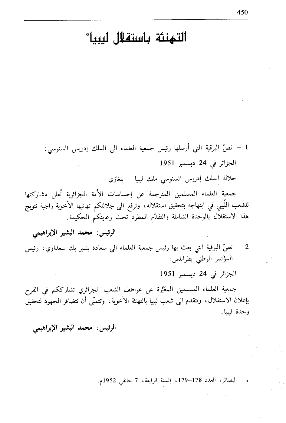 جمعية العلماء المسلمين المترجمة عن إحساسات الأمة الجزائرية تُعلن مشاركتها للشعب اللّيبي في ابتهاجه بتحقيق استقلاله، وترفع إلى جلالتكم تهانيها الأخوية راجية تتويج هذا الاستقلال بالوحدة الشاملة والتقدّم المطرد تحت رعايتكم الحكيمة.