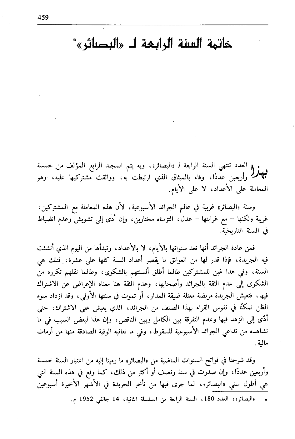 وسنة "البصائر" غريبة في عالم الجرائد الأسبوعية، لأن هذه المعاملة مع المشتركين، غريبة ولكنها- مع غرابتها- عدل، التزمناه مختارين، وإن أدى إلى تشويش وعدم انضباط في السنة التاريخية.
