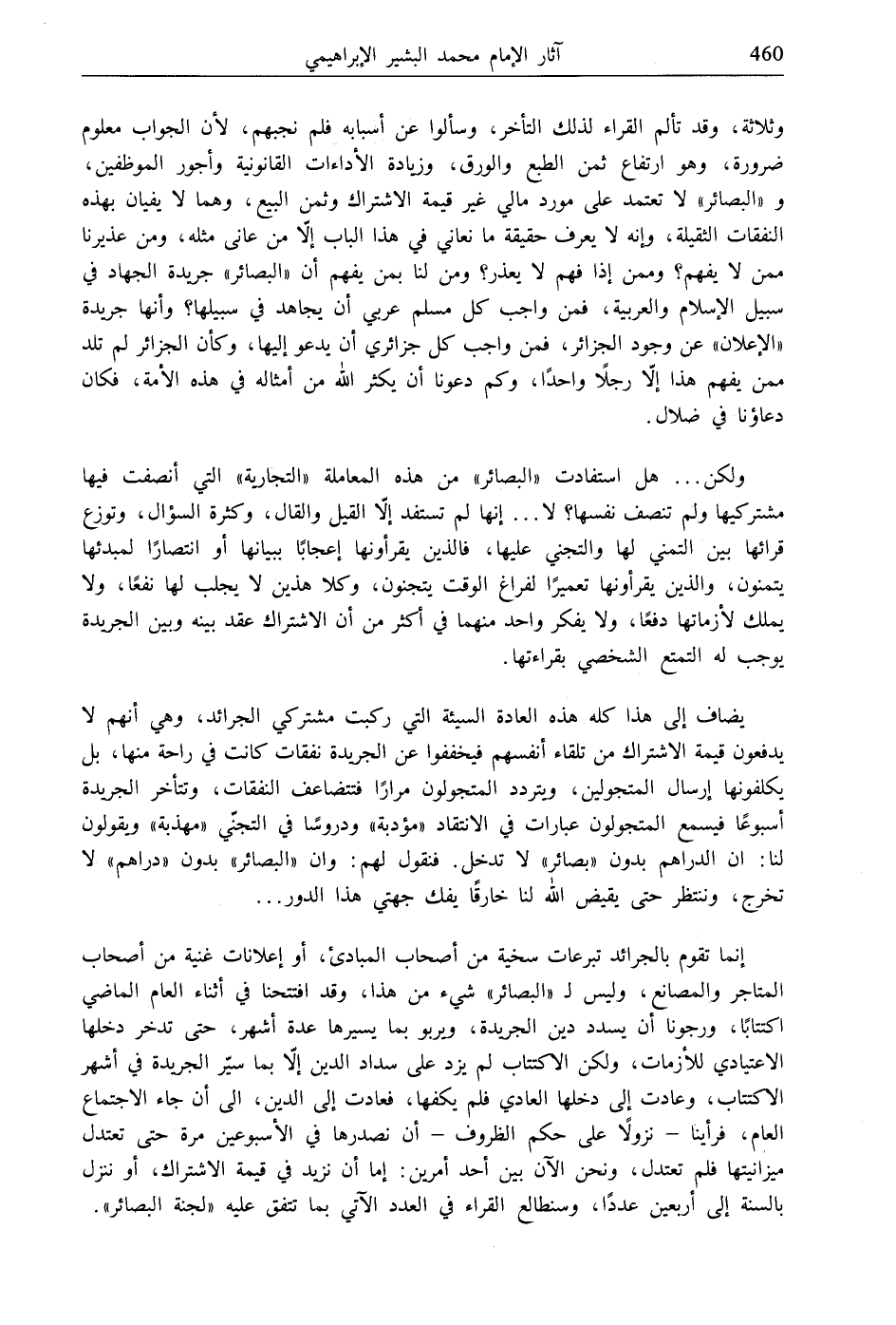 يضاف إلى هذا كله هذه العادة السيئة التي ركبت مشتركي الجرائد، وهي أنهم لا يدفعون قيمة الاشتراك من تلقاء أنفسهم فيخففوا عن الجريدة نفقات كانت في راحة منها، بل يكلفونها إرسال المتجولين، ويتردد المتجولون مرارًا فتتضاعف النفقات، وتتأخر الجريدة أسبوعًا فيسمع المتجولون عبارات في الانتقاد "مؤدبة" ودروسًا في التجنّي "مهذبة" ويقولون لنا: ان الدراهم بدون "بصائر" لا تدخل. فنقول لهم: وان "البصائر" بدون "دراهم " لا تخرج، وننتظر حتى يقيض الله لنا خارقًا يفك جهتي هذا الدور ...
