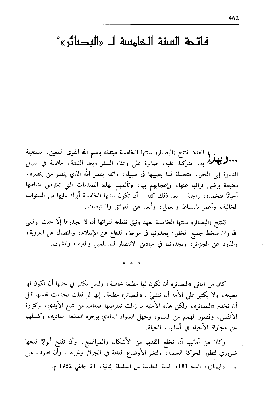 تفتتح "البصائر" سنتها الخامسة بعهد وثيق تقطعه لقرائها أن لا يجدوها إلّا حيث يرضى الله وان سخط جميع الخلق: يجدونها في مواقف الدفاع عن الإسلام، والنضال عن العروبة، والذود عن الجزائر، ويجدونها في ميادين الانتصار للمسلمين والعرب وللشرق.