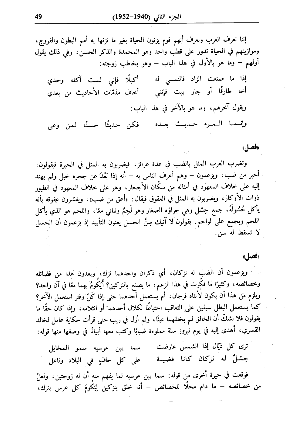 ويزعمون أن الضب له نزكان، أي ذكران واحدهما نزك، ويعدون هذا من فضائله وخصائصه، وكثيرًا ما فكرت في هذا الزعم، ما يصنع بالنزكين؟ أَيَكُوم بهما معًا في آن واحد؟ ويلزم من هذا أن يكون لأنثاه فرجان، أم يستعمل أحدهما حتى إذا كَلّ وفتر استعمل الآخر؟ كما يستعمل البطل سيفين على التعاقب احتياطًا لكلال أحدهما أو انثلامه، وإذا كان حقًا ما يقولون فلا نشكّ أن الخالق لم يخلقهما عبثًا، ولم أزل في ريب حتى قرأت حكاية عامل لخالد القسري، أهدى إليه في يوم نيروز سلة مملوءة ضبابًا وكتب معها أبياتًا في وصفها منها قوله:
