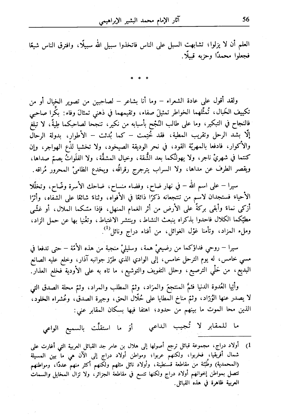 سيرا- على اسم الله- في نهار ضاح، وفضاء منساح، ضاحك الأسرة وضّاح، وتخلّلا الأحياءَ فستجدان لاسم من تنتجعانه ذكرًا ذائعًا في الأفواه، وثناءً شائعًا على الشفاه، وأثرًا أزكى نماءً وأبقى بركةً على الأرض من أثر الغمام المنهل، فإذا مسّكما الملال، أو غشّى مطيّكما الكلال فاحدوا بذكراه ينبعث النشاط، وينتشر الاغتباط، وتغْنيا بها عن حمل الزاد، وملء المزاد، وتأمنا غوْل الغوائل، من أفناء دراج ونائل (1).