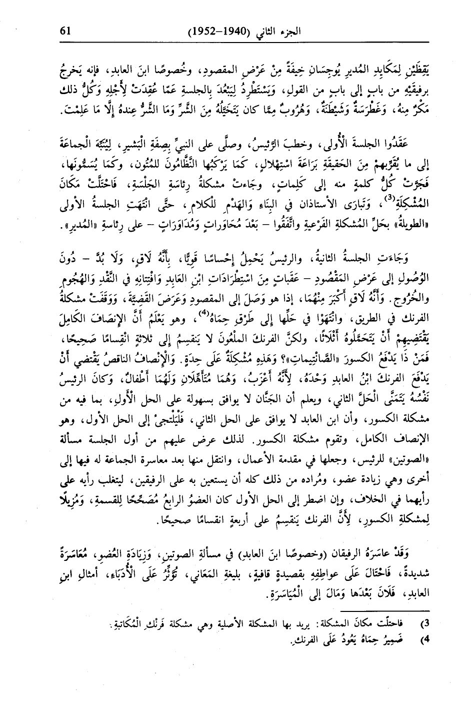 وَجَاءَتِ الْجَلْسَةُ الثَّانِيَّةُ، وَالرَّئِيسُ يَحْمِلُ إِحْسَاسًا قَوِيًّا، بِأَنَّهُ لَاقٍ، وَلَا بُدَّ- دُونَ الوُصُولِ إِلَى عَرْضِ الْمَقْصُودِ- عَقَبَاتٍ مِنَ اسْتِطْرَادَاتِ ابْنِ العَابِدِ وَافْتِتانِهِ فِي النَّقْدِ وَالْهُجُومِ وَالْخُرُوجِ. وَأَنَّهُ لَاقٍ أَكْبَرَ مِنْهُمَا، إِذَا هُوَ وَصَلَ إِلَى الْمَقْصُودِ وَعَرَضَ الْقَضِيَّةَ، وَوَقَفَتْ مُشْكِلَةُ الفَرَنْكِ فِي الطَّرِيقِ، وَانْتَهَوْا فِي حَلِّهَا إِلَى طَرْقِ حِمَاهُ (4)، وَهُوَ يَعْلَمُ أَنَّ الإِنْصَافَ الكَامِلَ يقْتَضِيهِمْ أَنْ يَتَحَمَّلُوهُ أَثْلَاثًا، وَلَكِنَّ الْفَرَنْكَ الْمَلْعُونَ لَا يَنْقَسِمُ إِلَى ثَلَاثَةٍ انْقِسَامًا صَحِيحًا، فَمَنْ ذَا يَدْفَعُ الْكُسُورَ "الصَّانْتِيمَاتِ"؟ وَهَذِهِ مُشْكِلَةٌ عَلَى حِدَةٍ. وَالْإِنْصَافُ النَّاقِصُ يَقْتَضِي أَنْ يَدْفَعَ الفَرَنْكَ ابْنُ الْعَابِدِ وَحْدَهُ، لِأَنَّهُ أَعْزَبُ، وَهُمَا مُتَأَهِّلَانِ وَلَهُمَا أَطْفالٌ، وَكَانَ الرَّئِيسُ نَفْسُهُ يَتَمَنَّى الْحَلَّ الثَّانِي، وَيَعْلَمُ أَنَّ الْجَنَّانَ لَا يُوَافِقُ بِسُهُولَةٍ عَلَى الْحَلِّ الْأَوَّلِ، بِمَا فِيهِ مِنْ مُشْكِلَةِ الْكُسُورِ، وَأَنَّ ابْنَ الْعَابِدِ لَا يُوَافِقُ عَلَى الْحَلِّ الثَّانِي، فَلْيَلْتَجِئْ إِلَى الْحِلِّ الْأَوَّلِ، وَهُوَ الْإِنْصَافُ الْكَامِلُ، وَتَقُومُ مُشْكِلَةُ الْكُسُورِ. لِذَلِكَ عَرَضَ عَلَيْهِمْ مِنْ أَوَّلِ الْجَلْسَةِ مَسْأَلَةُ "الْصَّوْتَيْنِ" لِلرَّئِيسِ، وَجَعَلَهَا فِي مُقَدِّمَةِ الْأَعْمَالِ، وَانْتَقَلَ مِنْهَا بَعْدَ مَعَاسَرَةِ الْجَمَاعَةِ لَهُ فِيهَا إِلَى أُخْرَى وَهِيَ زِيَادَةُ عُضْوٍ، وَمُرَادُهُ مِنْ ذَلِكَ كُلِّهِ أَنْ يَسْتَعِينَ بِهِ عَلَى الرَّفِيقَيْنِ، لِيَتَغَلَّبَ رَأْيَهُ عَلَى رَأْيِهِمَا فِي الْخِلَافِ، وَإِنِ اضْطُرَّ إِلَى الْحَلِّ الْأَوَّلِ كَانَ الْعُضْوُ الرَّابِعُ مُصَحِّحًا لِلِقِسْمَةِ، وَمُزِيلًا لِمُشْكِلَةِ الْكُسُورِ، لِأَنَّ الفَرَنْكَ يَنْقَسِمُ عَلَى أَرْبَعَةٍ انْقِسَامًا صَحِيحًا.
