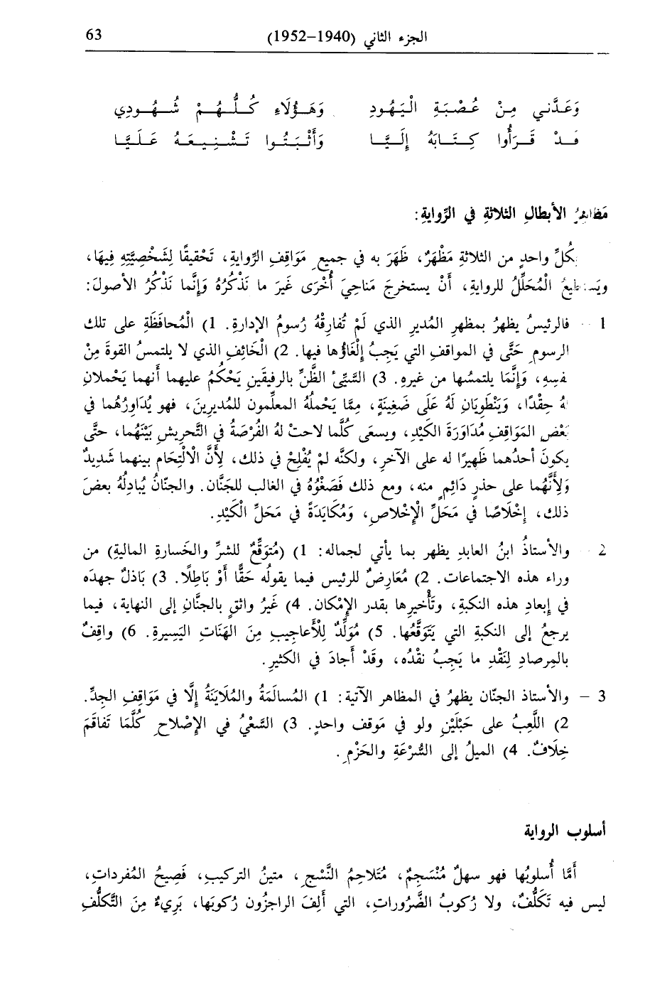 فِي إِبْعَادِ هَذِهِ النَّكْبَةِ، وَتَأْخِيرِهَا بِقَدَرِ الْإِمْكَانِ. 4) غَيْرُ وَاثِقٍ بِالْجَنَّانِ إِلَى النِّهَايَةِ، فِيمَا يَرْجِعُ إِلَى النَّكْبَةِ الَّتِي يَتَوَقَّعُهَا. 5) مُوَلِّدٌ لِلْأَعَاجِيبِ مِنَ الْهَنَاتِ الْيَسِيرَةِ. 6) وَاقِفٌ بِالْمِرْصَادِ لِنَقْدِ مَا يَجِبُ نَقْدُهُ، وَقَدْ أَجَادَ فِي الْكَثِيرِ.