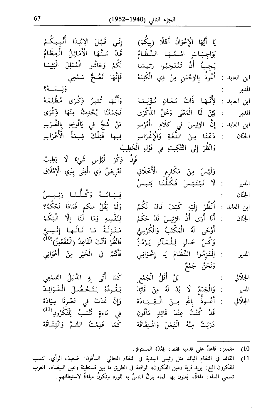 11) القائد في النظام البائد مثل رئيس البلدية في النظام الحالي. المأفون: ضعيف الرأي. تنسب للفكرون الخ: يريد قرية "عين الفكرون" الواقعة في الطريق ما بين قسنطينة وعين البيضاء، العرب تسمي الماء: ماءَةً، يَعنون بها الماء ينزلُ الناسُ به للورد وتكونُ مباءَةً لاستيطانهم.