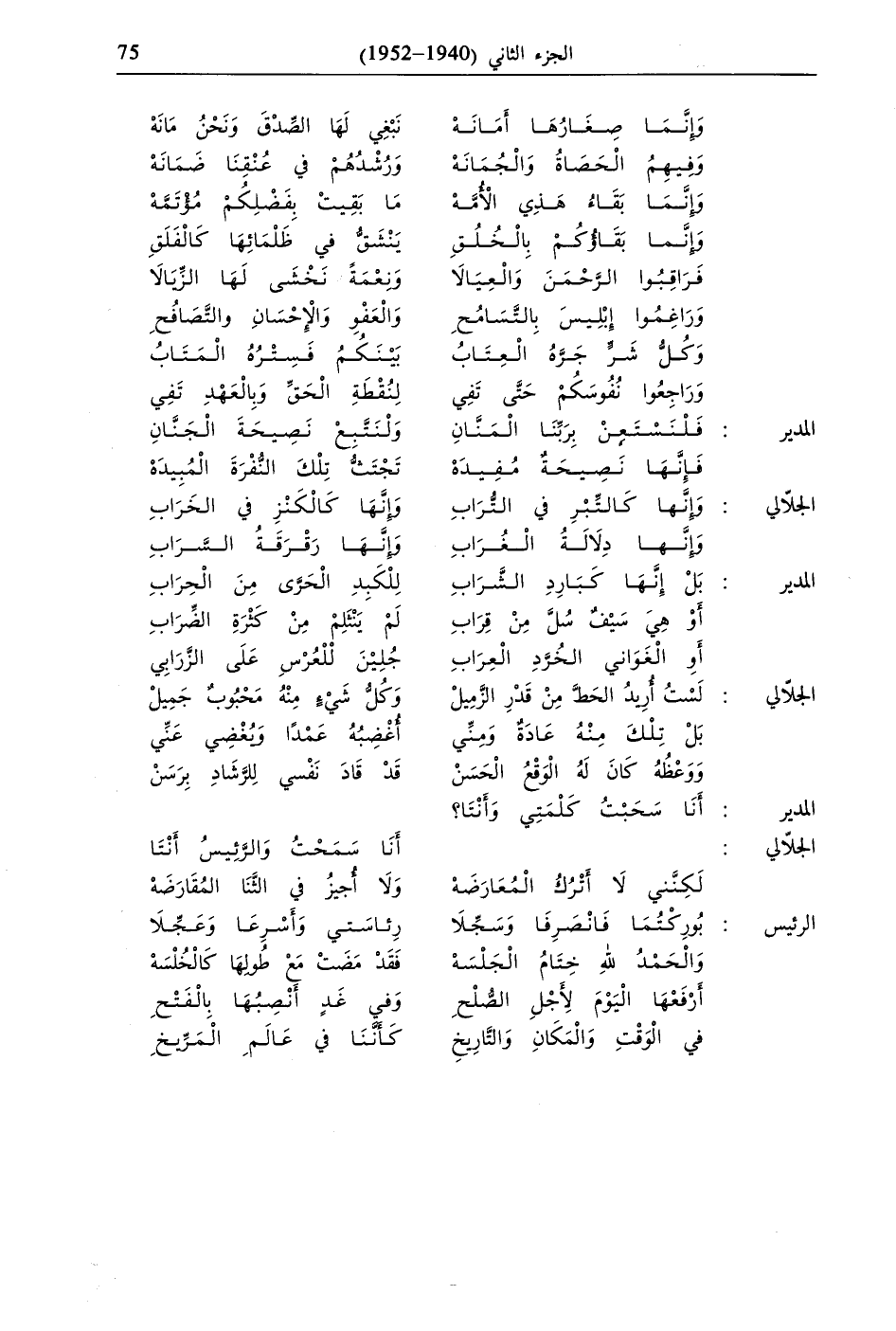 الْجَلَّالِي: لَسْتُ أُرِيدُ الحَطَّ مِنْ قَدْرِ الزَّمِيلْ … وَكُلُّ شَيْءٍ مِنْهُ مَحْبُوبٌ جَمِيلْ