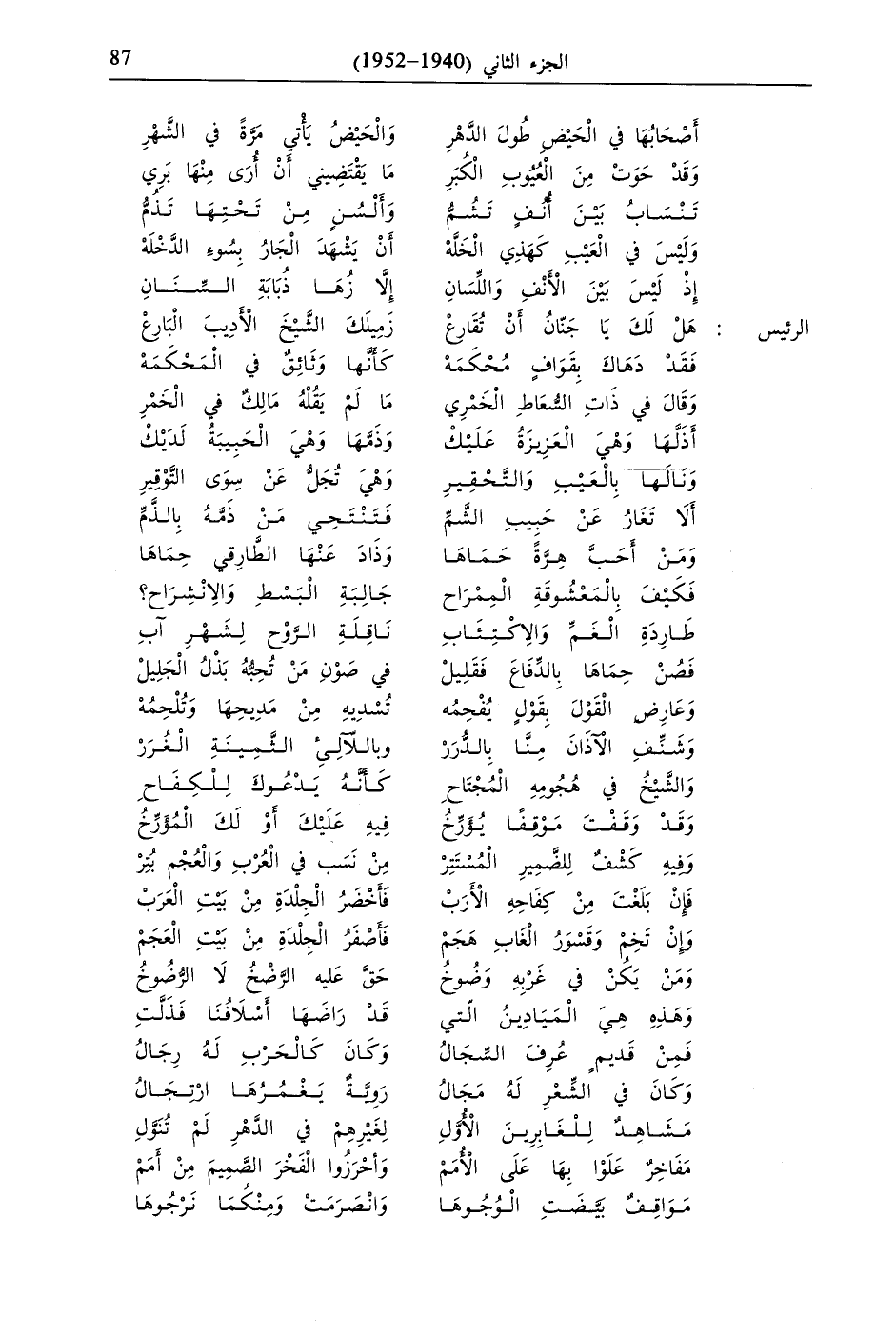 الرَّئِيسُ: هَلْ لَكَ يَا جَنَّانُ أَنْ تُقَارِعْ … زَمِيلَكَ الشَّيْخَ الْأَدِيبَ الْبَارِعْ