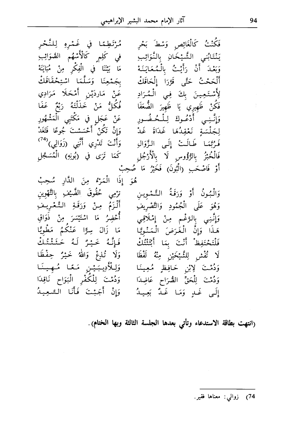 فَرُبَّمَا طَالَتْ إِلَى الزَّوَالِ … وَأَنْتَ تَدْرِي أَنَّنِي (زَوَالِي) (74)