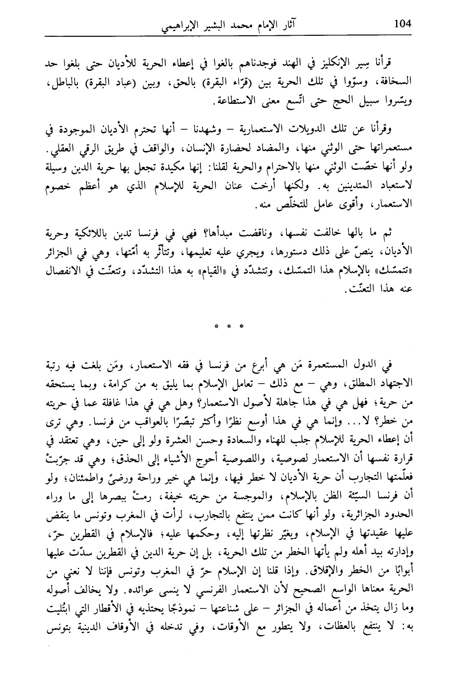 في الدول المستعمرة مَن هي أبرع من فرنسا في فقه الاستعمار، ومَن بلغت فيه رتبة الاجتهاد المطلق، وهي- مع ذلك- تعامل الإسلام بما يليق به من كرامة، وبما يستحقه من حرية، فهل هي في هذا جاهلة لأصول الاستعمار؟ وهل هي في هذا غافلة عما في حريته من خطر؟ لا ... وإنما هي في هذا أوسع نظرًا وأكثر تبصّرًا بالعواقب من فرنسا. وهي ترى أن إعطاء الحرية للإسلام جلب للهناء والسعادة وحسن العشرة ولو إلى حين، وهي تعتقد في قرارة نفسها أن الاستعمار لصوصية، واللصوصية أحوج الأشياء إلى الحذق، وهي قد جرّبتْ فعلّمتها التجارب أن حرية الأديان لا خطر فيها، وإنما هي خير وراحة ورضىً واطمئنان؛ ولو أن فرنسا السيّئة الظن بالإسلام، والموجسة من حريته خيفة، رمتْ ببصرها إلى ما وراء الحدود الجزائرية، ولو أنها كانت ممن ينتفع بالتجارب، لرأت في المغرب وتونس ما ينقض عليها عقيدتها في الإسلام، ولغيّر نظرتها إليه، وحكمها عليه، فالإسلام في القطرين حرّ، وإدارته بيد أهله ولم يأتها الخطر من تلك الحرية، بل إن حرية الدين في القطرين سدّت عليها أبوابًا من الخطر والإقلاق. وإذا قلنا إن الإسلام حرّ في المغرب وتونس فإننا لا نعني من الحرية معناها الواسع الصحيح لأن الاستعمار الفرنسي لا ينسى عوائده. ولا يخالف أصوله وما زال يتخذ من أعماله في الجزائر- على شناعتها- نموذجًا يحتذيه في الأقطار التي ابتليت به: لا ينتفع بالعظات، ولا يتطور مع الأوقات، وفي تدخله في الأوقاف الدينية بتونس