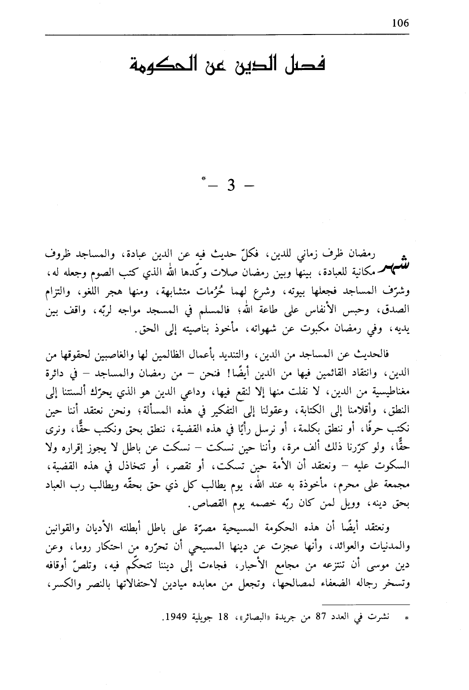 ونعتقد أيضًا أن هذه الحكومة المسيحية مصرّة على باطل أبطلته الأديان والقوانين والمدنيات والعوائد، وأنها عجزت عن دينها المسيحي أن تحرّره من احتكار روما، وعن دين موسى أن تنتزعه من مجامع الأحبار، فجاءت إلى ديننا تتحكّم فيه، وتلصّ أوقافه وتسخر رجاله الضعفاء لمصالحها، وتجعل من معابده ميادين لاحتفالاتها بالنصر والكسر،