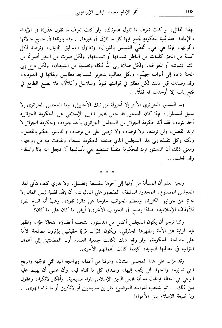 وما الدستور الجزائري الأبتر إلا أحبولة من تلك الأحابيل، وما المجلس الجزائري إلا سليل للمسلول، فإذا كان الدستور قد جعل فصل الدين الإسلامي عن الحكومة الجزائرية أحد بنوده، فقد أيّد حكومة الجزائر من المجلس الجزائري بأحد جنوده، وحكومة الجزائر لا تريد الفصل، ولن تريده، ولا ترضاه، ولا ترضى على من يرضاه؛ والدستور حكم بالفصل، ولكنه وكل تنفيذه إلى هذا المجلس الذي صنعته الحكومة بيدها، ونفخت فيه من روحها، ومعنى ذلك أن الدستور ترك للحكومة منفذًا تستطيع هي بأساليبها أن تجعل منه بابًا واسعًا، وقد فعلت ...