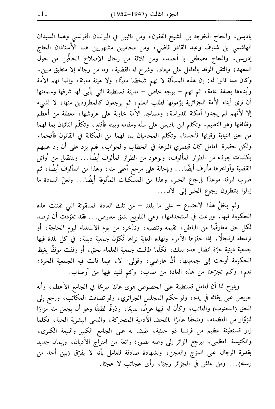 باديس، والحاج الخوجة بن الشيخ الفقون، ومن نائبين في البرلمان الفرنسي وهما السيدان الهاشمي بن شنوف وعبد القادر قاضي، ومن محاميين مشهورين هما الأستاذان الحاج إدريس، والحاج مصطفى با أحمد، ومن ثلاثة من رجال الإصلاح الحافِّين من حول المعهد، والتقى الوفد بالعامل على ميعاد، وشرح له القضية، وما من رجاله إلا منطيق مبين، وكان مما قالوا له: إن هذه المسألة لا تهم شخصًا معينًا، ولا هيئة معينة، وإنما تهم الأمة وأبناءها بصفة عامة، ثم تهم- بوجه خاص- مدينة قسنطينة التي يأبى لها شرفها وسمعتها أن ترى أبناء الأمة الجزائرية يؤمونها لطلب العلم، ثم يرجعون كالمطرودين منها، لا لشيء إلا لأنهم لم يجدوا أمكنة للدراسة، ومساجد الأمة خاوية على عروشها، معطلة من أعظم وظائفها وهو التعليم، وتكلم ابن باديس على سنّه ومقامه وبيته فأقنع، وتكلّم النائبان بما لهما من حق النيابة وقوتها فأحسنا، وتكلم المحاميان بما لهما من المكانة في القانون فأفحما، ولكن حضرة العامل كان قيصري النزعة في الخطاب والجواب، فلم يزد على أن رد عليهم بكلمات جوفاء من الطراز المألوف، وبوعود من الطراز المألوف أيضًا ... وبتنصّل من أوائل القضية وأواخرها مألوف أيضًا ... وبإحالة على مرجع أعلى منه، وهذا من المألوف أيضًا، ثم ضرب للوفد موعدًا بإرجاع الخبر، وهذا من المسكنات المألوفة أيضًا ... ولعلّ السادة ما زالوا ينتظرون رجوع الخبر إلى الآن ...