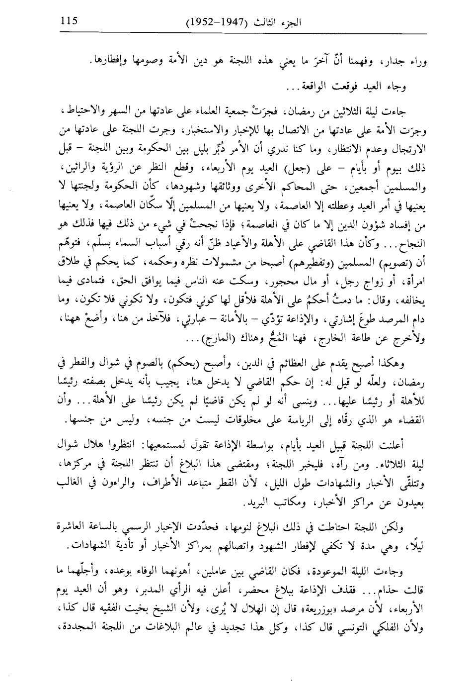 ولكن اللجنة احتاطت في ذلك البلاغ لنومها، فحدّدت الإخبار الرسمي بالساعة العاشرة ليلًا، وهي مدة لا تكفي لإفطار الشهود واتصالهم بمراكز الأخبار أو تأدية الشهادات. وجاءت الليلة الموعودة، فكان القاضي بين عاملين، أهونهما الوفاء بوعده، وأجلّهما ما قالت حذام ... فقذف الإذاعة ببلاع محضر، أعلن فيه الرأي المدبر، وهو أن العيد يوم الأربعاء، لأن مرصد "بوزريعة" قال إن الهلال لا يُرى، ولأن الشيخ بخيت الفقيه قال كذا، ولأن الفلكي التونسي قال كذا، وكل هذا تجديد في عالم البلاغات من اللجنة المجددة،