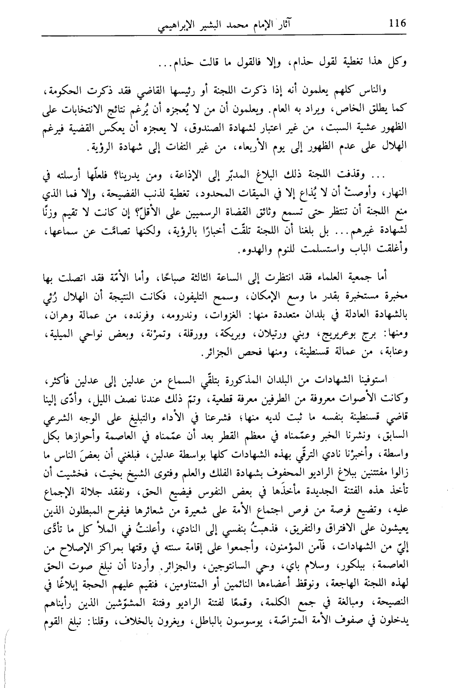استوفينا الشهادات من البلدان المذكورة بتلقّي السماع من عدلين إلى عدلين فأكثر، وكانت الأصوات معروفة من الطرفين معرفة قطعية، وتمّ ذلك عندنا نصف الليل، وأدّى إلينا قاضي قسنطينة بنفسه ما ثبت لديه منها؛ فشرعنا في الأداء والتبليغ على الوجه الشرعي السابق، ونشرنا الخبر وعمّمناه في معظم القطر بعد أن عمّمناه في العاصمة وأحوازها بكل واسطة، وأخبرْنا نادي الترقّي بهذه الشهادات كلها بواسطة عدلين، فبلغني أن بعضَ الناس ما زالوا مفتتنين ببلاع الراديو المحفوف بشهادة الفلك والعلم وفتوى الشيخ بخيت، فخشيت أن تأخذ هذه الفتنة الجديدة مأخذها في بعض النفوس فيضيع الحق، ونفقد جلالة الإجماع عليه، وتضيع فرصة من فرص اجتماع الأمة على شعيرة من شعائرها فيفرح المبطلون الذين يعيشون على الافتراق والتفريق، فذهبتُ بنفسي إلى النادي، وأعلنتُ في الملأ كل ما تأدَّى إليّ من الشهادات، فآمن المؤمنون، وأجمعوا على إقامة سنته في وقتها بمراكز الإصلاح من العاصمة، ببلكور، وسلام باي، وحي السانتوجين، والجزائر، وأردنا أن نبلغ صوت الحق لهذه اللجنة الهاجعة، ونوقظ أعضاءها النائمين أو المتناومين، فنقيم عليهم الحجة إبلاغًا في النصيحة، ومبالغة في جمع الكلمة، وقمعًا لفتنة الراديو وفتنة المشوّشين الذين رأيناهم يدخلون في صفوف الأمة المتراصّة، يوسوسون بالباطل، ويغرون بالخلاف، وقلنا: نبلغ القوم