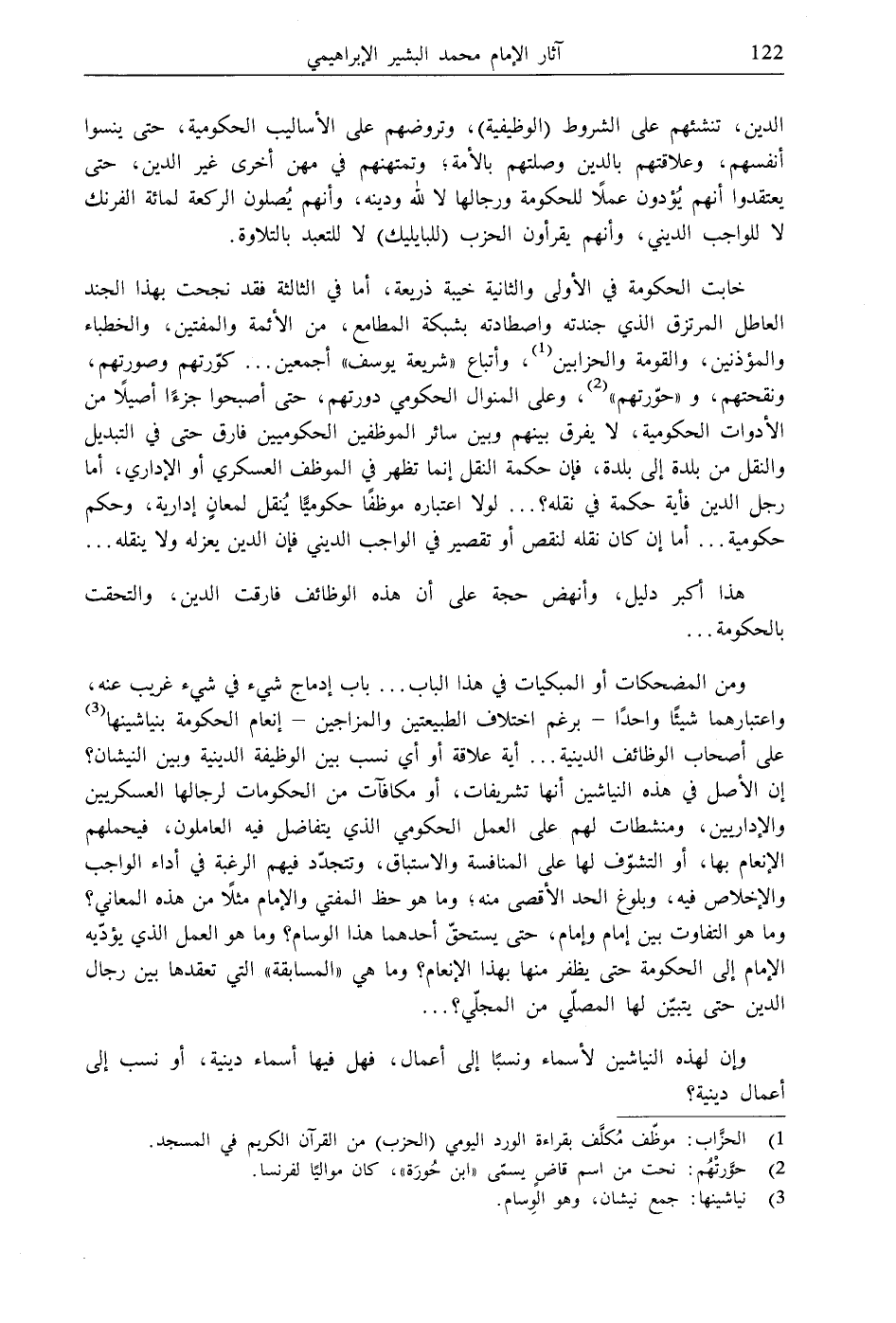 الدين، تنشئهم على الشروط (الوظيفية)، وتروضهم على الأساليب الحكومية، حتى ينسوا أنفسهم، وعلاقتهم بالدين وصلتهم بالأمة، وتمتهنهم في مهن أخرى غير الدين، حتى يعتقدوا أنهم يُؤدون عملًا للحكومة ورجالها لا لله ودينه، وأنهم يُصلون الركعة لمائة الفرنك لا للواجب الديني، وأنهم يقرأون الحزب (للبايليك) لا للتعبد بالتلاوة.