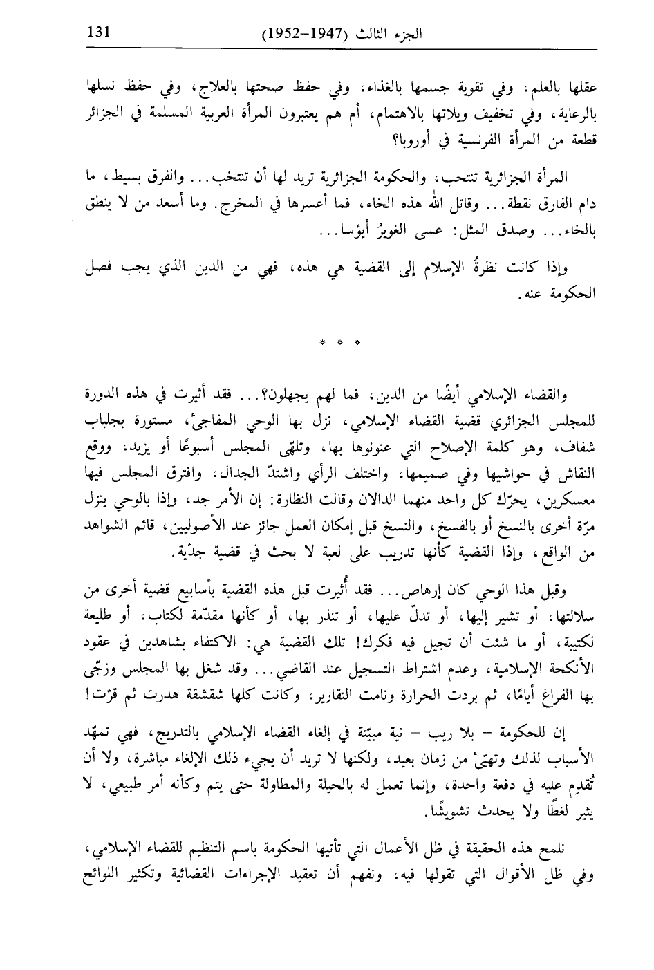 والقضاء الإسلامي أيضًا من الدين، فما لهم يجهلون؟ ... فقد أثيرت في هذه الدورة للمجلس الجزائري قضية القضاء الإسلامي، نزل بها الوحي المفاجئ، مستورة بجلباب شفاف، وهو كلمة الإصلاح التي عنونوها بها، وتلهّى المجلس أسبوعًا أو يزيد، ووع النقاش في حواشيها وفي صميمها، واختلف الرأي واشتدّ الجدال، وافترق المجلس فيها معسكرين، يحرّك كل واحد منهما الدالان وقالت النظارة: إن الأمر جد، وإذا بالوحي ينزل مرّة أخرى بالنسخ أو بالفسخ، والنسخ قبل إمكان العمل جائز عند الأصوليين، قائم الشواهد من الواقع، وإذا القضية كأنها تدريب على لعبة لا بحث في قضية جدّية.