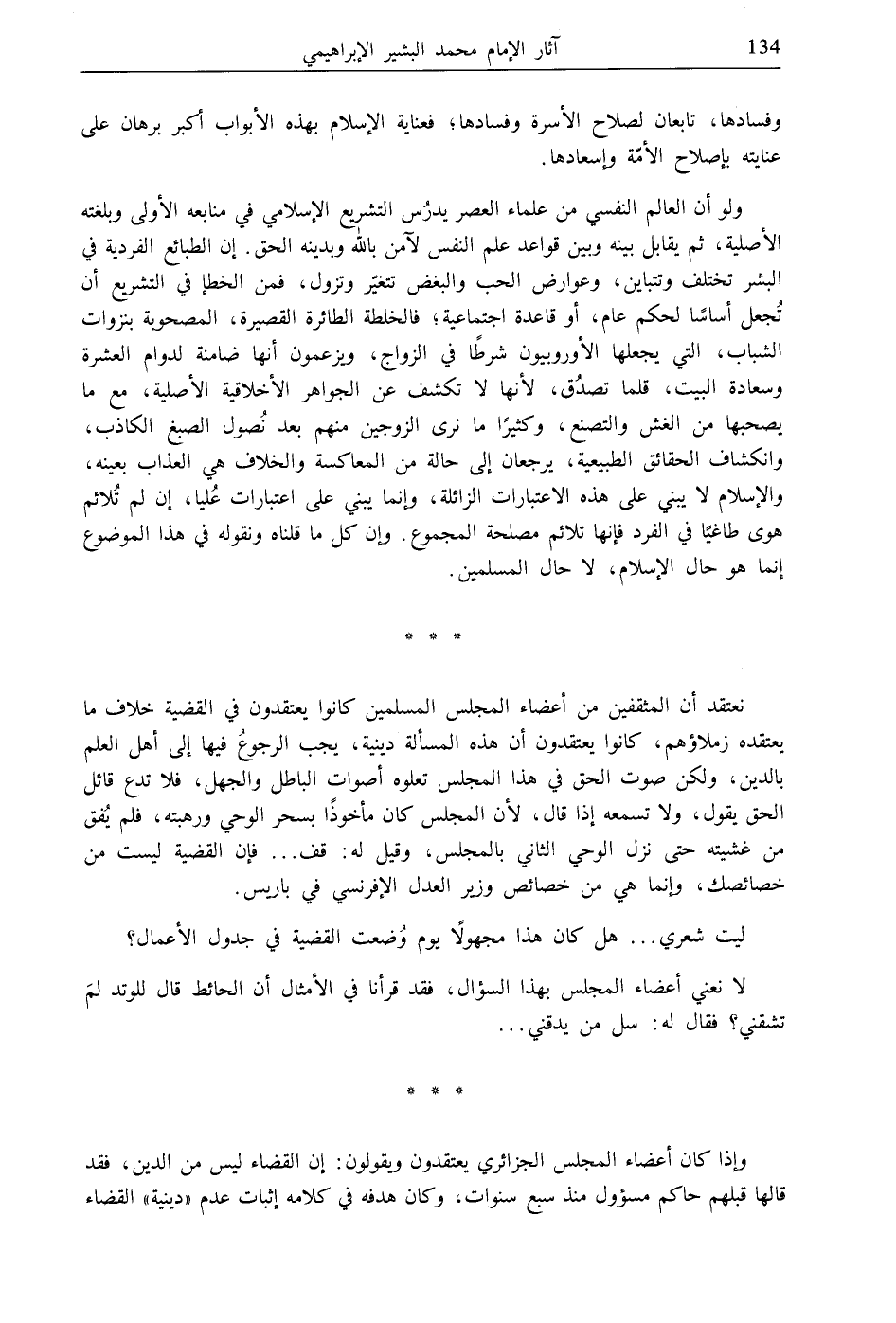 نعتقد أن المثقفين من أعضاء المجلس المسلمين كانوا يعتقدون في القضية خلاف ما يعتقده زملاؤهم، كانوا يعتقدون أن هذه المسألة دينية، يجب الرجوعُ فيها إلى أهل العلم بالدين، ولكن صوت الحق في هذا المجلس تعلوه أصوات الباطل والجهل، فلا تدع قائل الحق يقول، ولا تسمعه إذا قال، لأن المجلس كان مأخوذًا بسحر الوحي ورهبته، فلم يُفق من غشيته حتى نزل الوحي الثاني بالمجلس، وقيل له: قف ... فإن القضية ليست من خصائصك، وإنما هي من خصائص وزير العدل الإفرنسي في باريس.