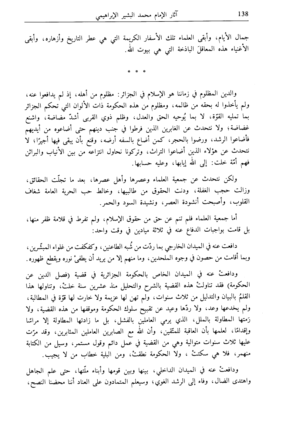 ولكن نتحدث عن جمعية العلماء وعصرها وأهل عصرها، بعد ما تجلّت الحقائق، وزالت حجب الغفلة، ودنت الحقوق من طالبيها، وخالط حب الحرية العامة شغاف القلوب، وأصبحت أنشودة العصر، ونشيدة السود والحمر.