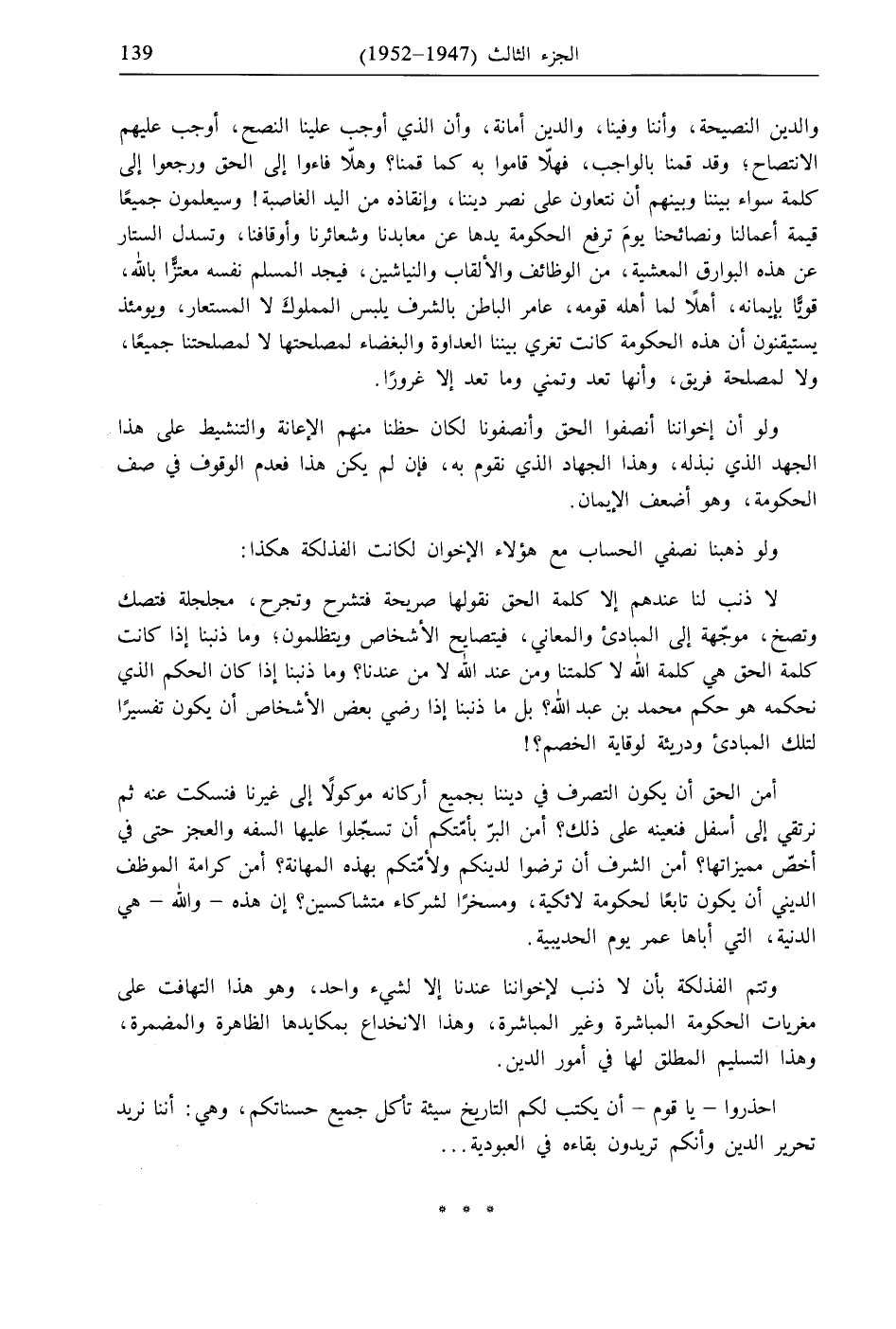 والدين النصيحة، وأننا وفينا، والدين أمانة، وأن الذي أوجب علينا النصح، أوجب عليهم الانتصاح، وقد قمنا بالواجب، فهلّا قاموا به كما قمنا؟ وهلّا فاءوا إلى الحق ورجعوا إلى كلمة سواء بيننا وبينهم أن نتعاون على نصر ديننا، وإنقاذه من اليد الغاصبة! وسيعلمون جميعًا قيمة أعمالنا ونصائحنا يومَ ترفع الحكومة يدها عن معابدنا وشعائرنا وأوقافنا، وتسدل الستار عن هذه البوارق المعشية، من الوظائف والألقاب والنياشين، فيجد المسلم نفسه معتزًّا بالله، قويًّا بإيمانه، أهلًا لما أهله قومه، عامر الباطن بالشرف يلبس المملوكَ لا المستعار، ويومئذ يستيقنون أن هذه الحكومة كانت تغري بيننا العداوة والبغضاء لمصلحتها لا لمصلحتنا جميعًا، ولا لمصلحة فريق، وأنها تعد وتمني وما تعد إلا غرورًا.