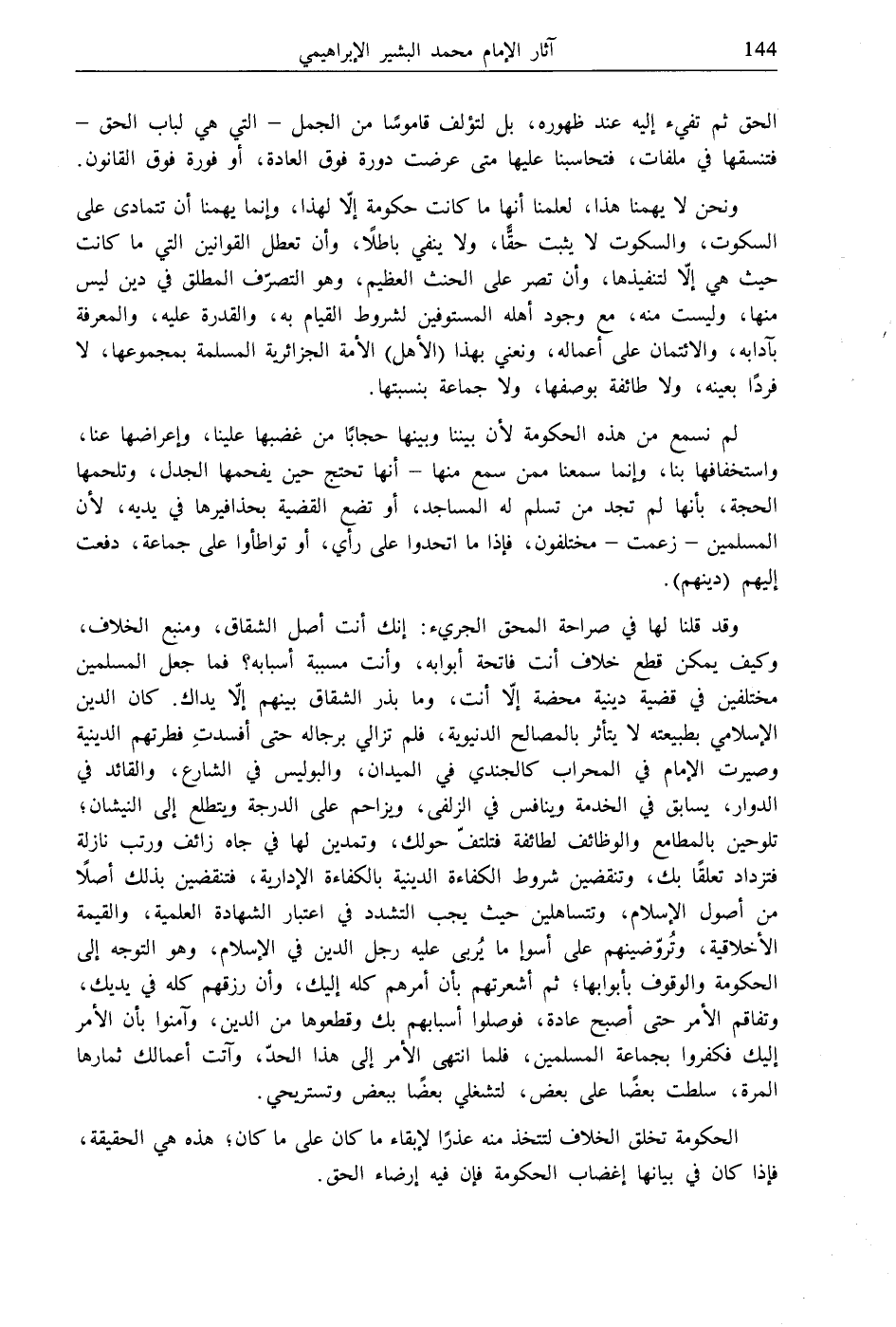 ونحن لا يهمنا هذا، لعلمنا أنها ما كانت حكومة إلّا لهذا، وإنما يهمنا أن تتمادى على السكوت، والسكوت لا يثبت حقًّا، ولا ينفي باطلًا، وأن تعطل القوانين التي ما كانت حيث هي إلّا لتنفيذها، وأن تصر على الحنث العظيم، وهو التصرّف المطلق في دين ليس منها، وليست منه، مع وجود أهله المستوفين لشروط القيام به، والقدرة عليه، والمعرفة بآدابه، والائتمان على أعماله، ونعني بهذا (الأهل) الأمة الجزائرية المسلمة بمجموعها، لا فردًا بعينه، ولا طائفة بوصفها، ولا جماعة بنسبتها.