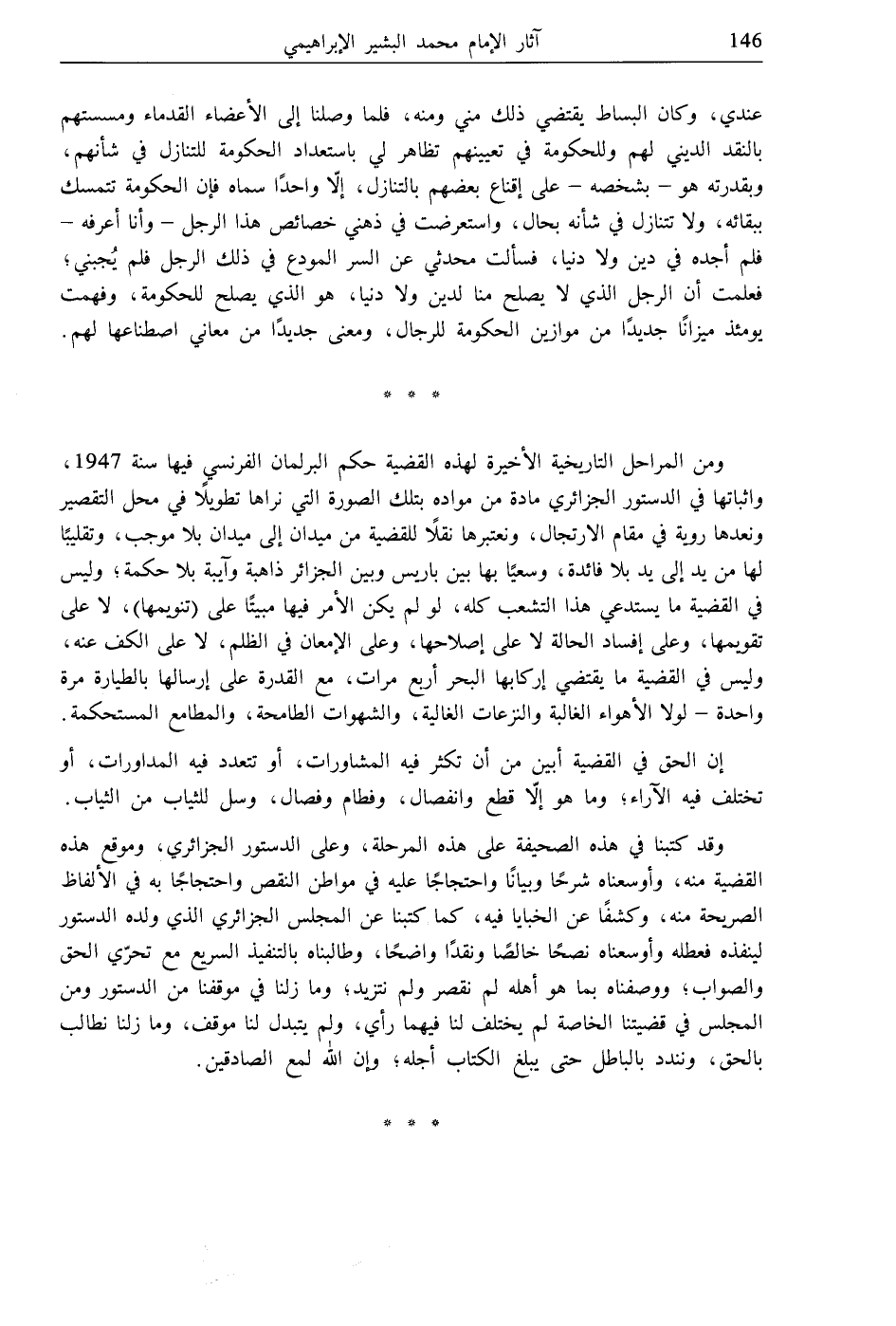 ومن المراحل التاريخية الأخيرة لهذه القضية حكم البرلمان الفرنسي فيها سنة 1947، واثباتها في الدستور الجزائري مادة من مواده بتلك الصورة التي نراها تطويلًا في محل التقصير ونعدها روية في مقام الارتجال، ونعتبرها نقلًا للقضية من ميدان إلى ميدان بلا موجب، وتقليبًا لها من يد إلى يد بلا فائدة، وسعيًا بها بين باريس وبين الجزائر ذاهبة وآيبة بلا حكمة؛ وليس في القضية ما يستدعي هذا التشعب كله، لو لم يكن الأمر فيها مبيتًا على (تنويمها)، لا على تقويمها، وعلى إفساد الحالة لا على إصلاحها، وعلى الإمعان في الظلم، لا على الكف عنه، وليس في القضية ما يقتضي إركابها البحر أربع مرات، مع القدرة على إرسالها بالطيارة مرة واحدة- لولا الأهواء الغالبة والنزعات الغالية، والشهوات الطامحة، والمطامع المستحكمة.