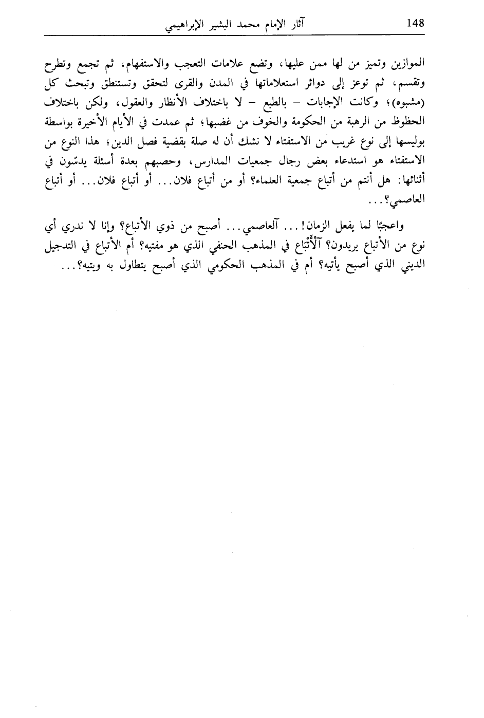 واعجبًا لما يفعل الزمان! ... آلعاصمي ... أصبح من ذوي الأتباع؟ وإنا لا ندري أي نوع من الأتباع يريدون؟ آلْأَتْبَاع في المذهب الحنفي الذي هو مفتيه؟ أم الأتباع في التدجيل الديني الذي أصبح يأتيه؟ أم في المذهب الحكومي الذي أصبح يتطاول به ويتيه؟ ...