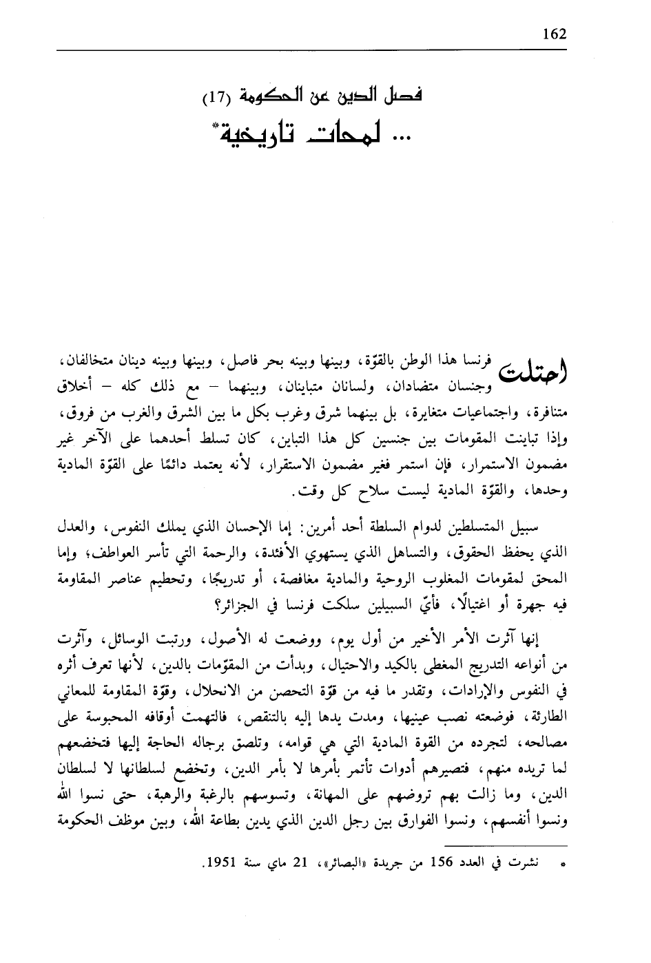 سبيل المتسلطين لدوام السلطة أحد أمرين: إما الإحسان الذي يملك النفوس، والعدل الذي يحفظ الحقوق، والتساهل الذي يستهوي الأفئدة، والرحمة التي تأسر العواطف، وإما المحق لمقومات المغلوب الروحية والمادية مغافصة، أو تدريجًا، وتحطيم عناصر المقاومة فيه جهرة أو اغتيالًا، فأيّ السبيلين سلكت فرنسا في الجزائر؟